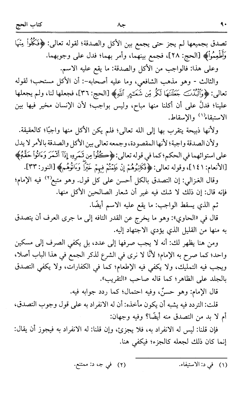 ولأن الصدقة واجبة؛ لأنها المقصودة، وجمعه تعالى بين الأكل والصدقة بالأمر لا يدل على استوائهما في الحكم؛ كما في قوله تعالى: {كُلُوا مِنْ ثَمَرِهِ إِذَا أَثْمَرَ وَآتُوا حَقَّهُ} [الأنعام: 141]، وقوله تعالى: {فَكَاتِبُوهُمْ إِنْ عَلِمْتُمْ فِيهِمْ خَيْراً وَآتُوهُمْ} [النور: 33].
