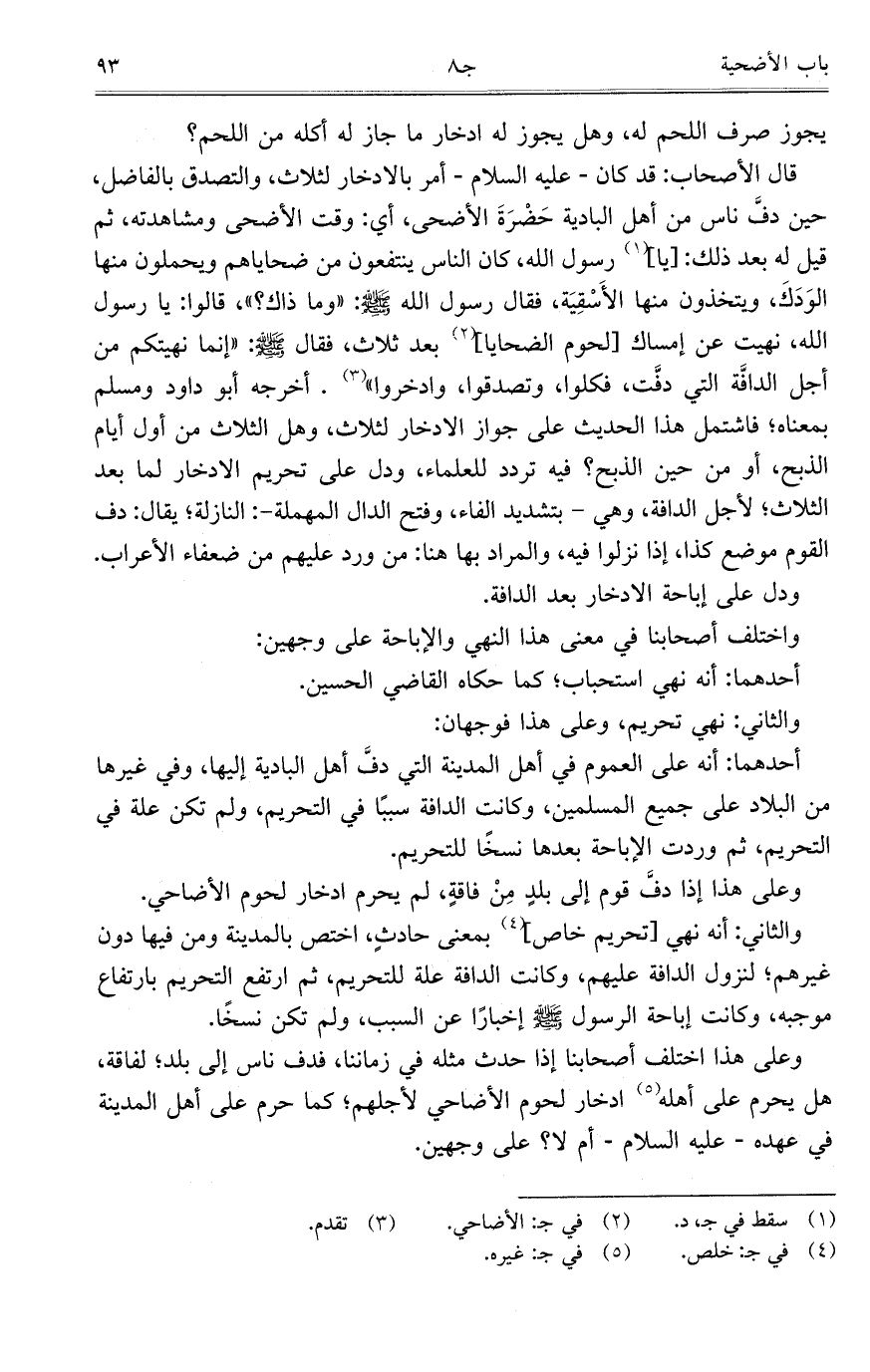 قال الأصحاب: قد كان – عليه السلام- أمر بالادخار لثلاث، والتصدق بالفاضل، حين دفَّ ناس من أهل البادية حَضْرَةَ الأضحى، أي: وقت الأضحى ومشاهدته، ثم قيل له بعد ذلك: [يا] رسول الله، كان الناس ينتفعون من ضحاياهم ويحملون منها الوَدَكَ، ويتخذون منها الأَسْقِيَة، فقال رسول الله - صلى الله عليه وسلم -: "وما ذاك؟، قالوا: يا رسول الله، نهيت عن إمساك [لحوم الضحايا] بعد ثلاث، فقال - صلى الله عليه وسلم -: "إنما نهيتكم من أجل الدافَّة التي دفَّت، فكلوا، وتصدقوا، وادخروا". أخرجه أبو داود ومسلم بمعناه؛ فاشتمل هذا الحديث على جواز الادخار لثلاث، وهل الثلاث من أول أيام الذبح، أو من حين الذبح؟ فيه تردد للعلماء، ودل على تحريم الادخار لما بعد الثلاث؛ لأجل الدافة، وهي- بتشديد الفاء، وفتح الدال المهملة-: النازلة؛ يقال: دف القوم موضع كذا، إذا نزلوا فيه، والمراد بها هنا: من ورد عليهم من ضعفاء الأعراب.