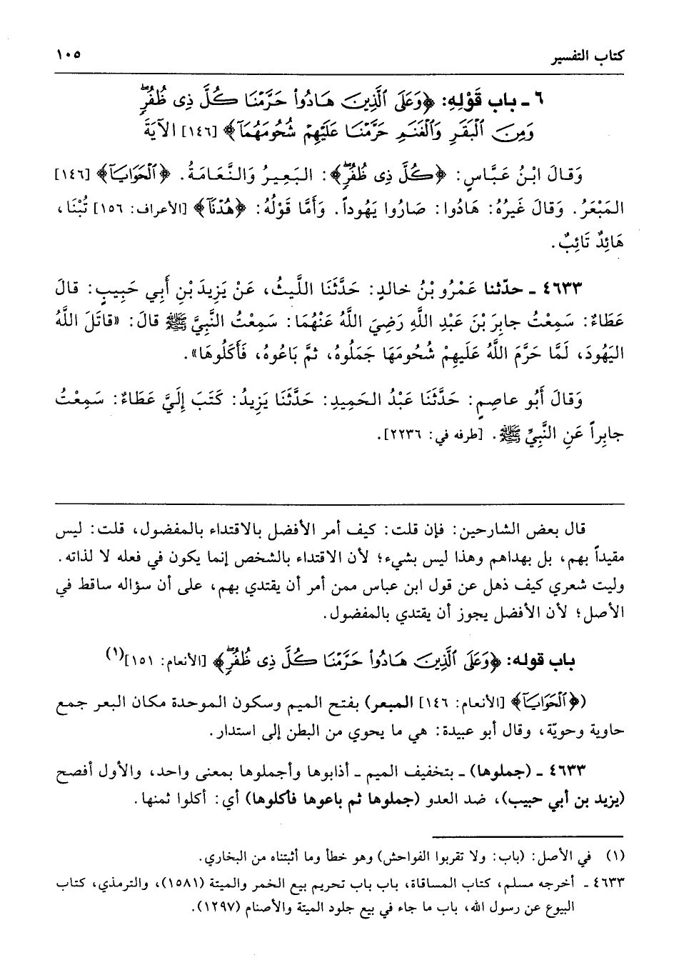 4633 - (جملوها) -بتخفيف الميم- أذابوها وأجملوها بمعنى واحد، والأول أفصح (يزيد بن أبي حبيب)، ضد العدو (جملوها ثم باعوها فكلوها) أي: أكلوا ثمنها.