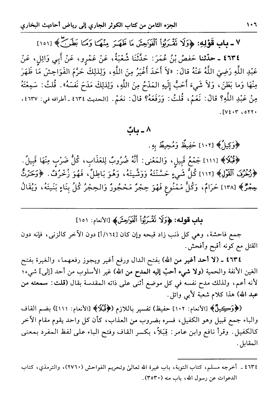4634 - (لا أحد أغير من الله) بفتح الدال ورفع أغير ويجوز رفعهما، والغيرة بفتح الغين الأنفة والحمية (ولا شيء أحبّ إليه المدح من الله) غير الأسلوب من أحد [إلى] شيء؛ لأنه أعم، ولذلك مدح نفسه في كل موضع أثنى على ذاته المقدسة بقال (قلت: سمعته من عبد الله) هذا كلام شعبة لأبي وائل.