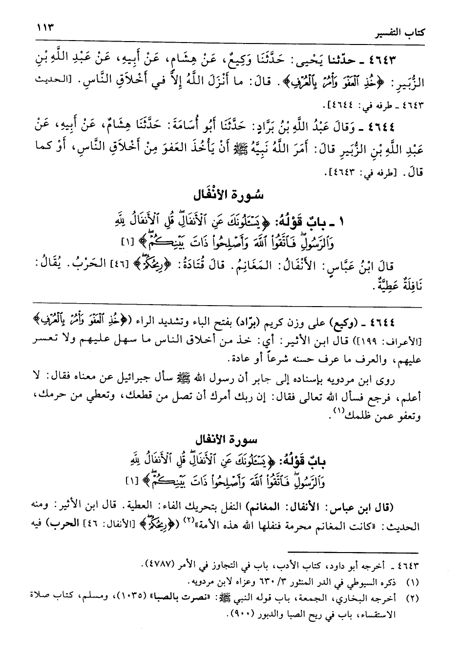 1 - باب قَوْلُهُ (يَسْأَلُونَكَ عَنِ الأَنْفَالِ قُلِ الأَنْفَالُ لِلَّهِ وَالرَّسُولِ فَاتَّقُوا اللَّهَ وَأَصْلِحُوا ذَاتَ بَيْنِكُمْ).