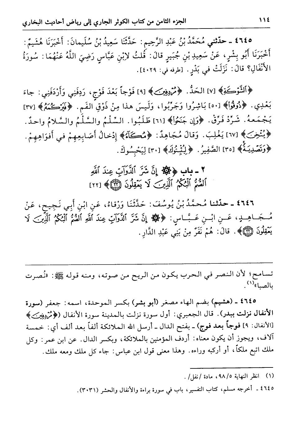 4645 - (هشيم) بضم الهاء مصغر (أبو بشر) بكسر الموحدة، اسمه: جعفر (سورة الأنفال نزلت ببدر). قال الجعبري: أول سورة نزلت بالمدينة سورة الأنفال {مُرْدِفِينَ} [الأنفال: 9] فوجًا بعد فوج) -بفتح الدال- أرسل الله الملائكة ألفًا بعد ألف أي: خمسة آلاف، ويجوز أن يكون معناه: أردف المؤمنين بالملائكة، وبكسر الدال. عن ابن عمر: وكل ملك اتبع ملكًا، أو أركبه وراءه. وهذا معنى قول ابن عباس: جاء كل ملك ومعه ملك.