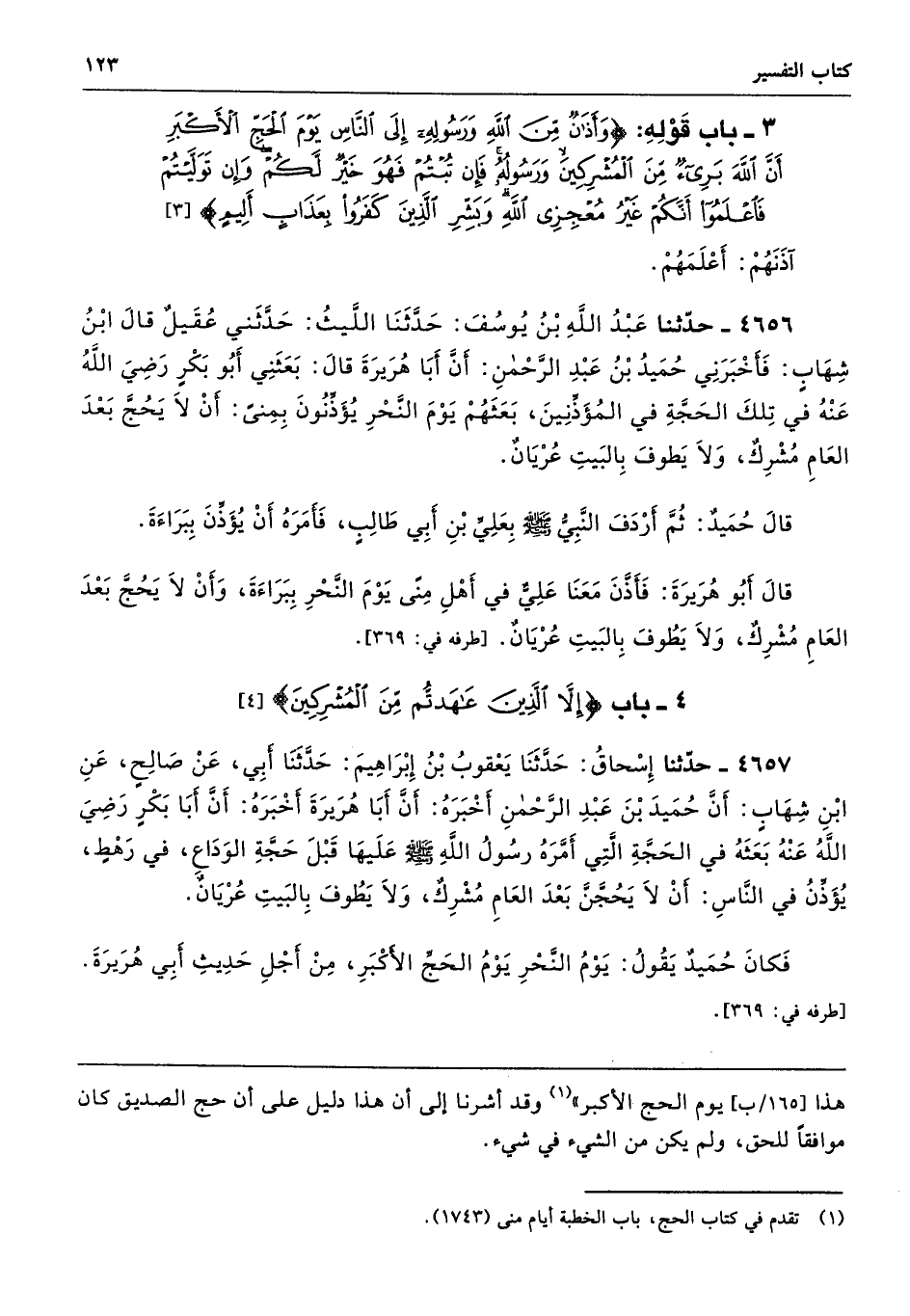 3 - باب قَوْلِهِ (وَأَذَانٌ مِنَ اللَّهِ وَرَسُولِهِ إِلَى النَّاسِ يَوْمَ الْحَجِّ الأَكْبَرِ أَنَّ اللَّهَ بَرِئٌ مِنَ الْمُشْرِكِينَ وَرَسُولُهُ فَإِنْ تُبْتُمْ فَهُوَ خَيْرٌ لَكُمْ وَإِنْ تَوَلَّيْتُمْ فَاعْلَمُوا أَنَّكُمْ غَيْرُ مُعْجِزِى اللَّهِ وَبَشِّرِ الَّذِينَ كَفَرُوا بِعَذَابٍ أَلِيمٍ)