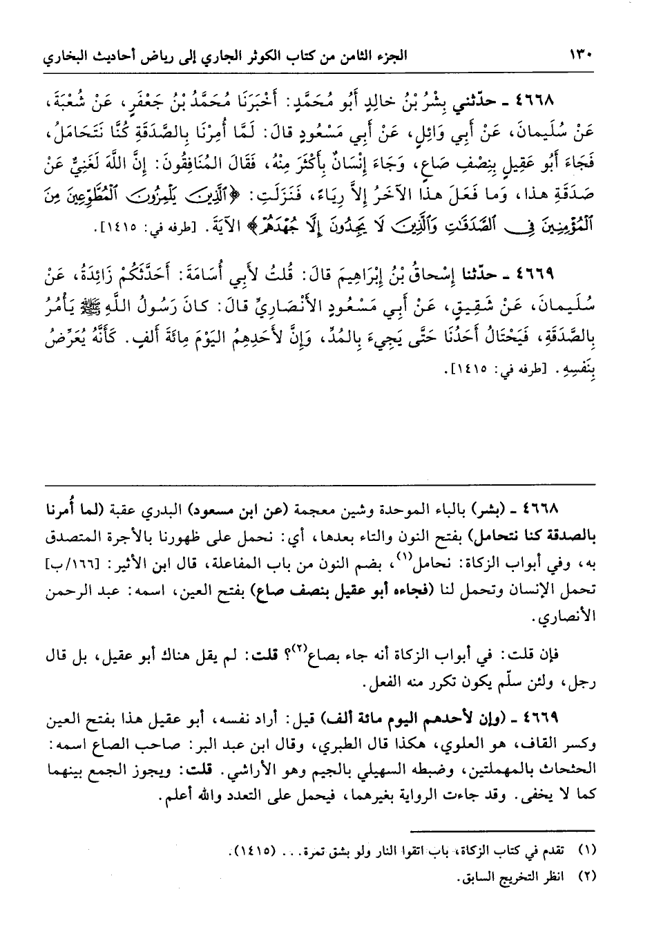 4669 - حَدَّثَنَا إِسْحَاقُ بْنُ إِبْرَاهِيمَ قَالَ قُلْتُ لأَبِى أُسَامَةَ أَحَدَّثَكُمْ زَائِدَةُ عَنْ سُلَيْمَانَ عَنْ شَقِيقٍ عَنْ أَبِى مَسْعُودٍ الأَنْصَارِىِّ قَالَ كَانَ رَسُولُ اللَّهِ - صلى الله عليه وسلم - يَأْمُرُ بِالصَّدَقَةِ، فَيَحْتَالُ أَحَدُنَا حَتَّى يَجِئَ بِالْمُدِّ، وَإِنَّ لأَحَدِهِمِ الْيَوْمَ مِائَةَ أَلْفٍ. كَأَنَّهُ يُعَرِّضُ بِنَفْسِهِ. طرفه 1415