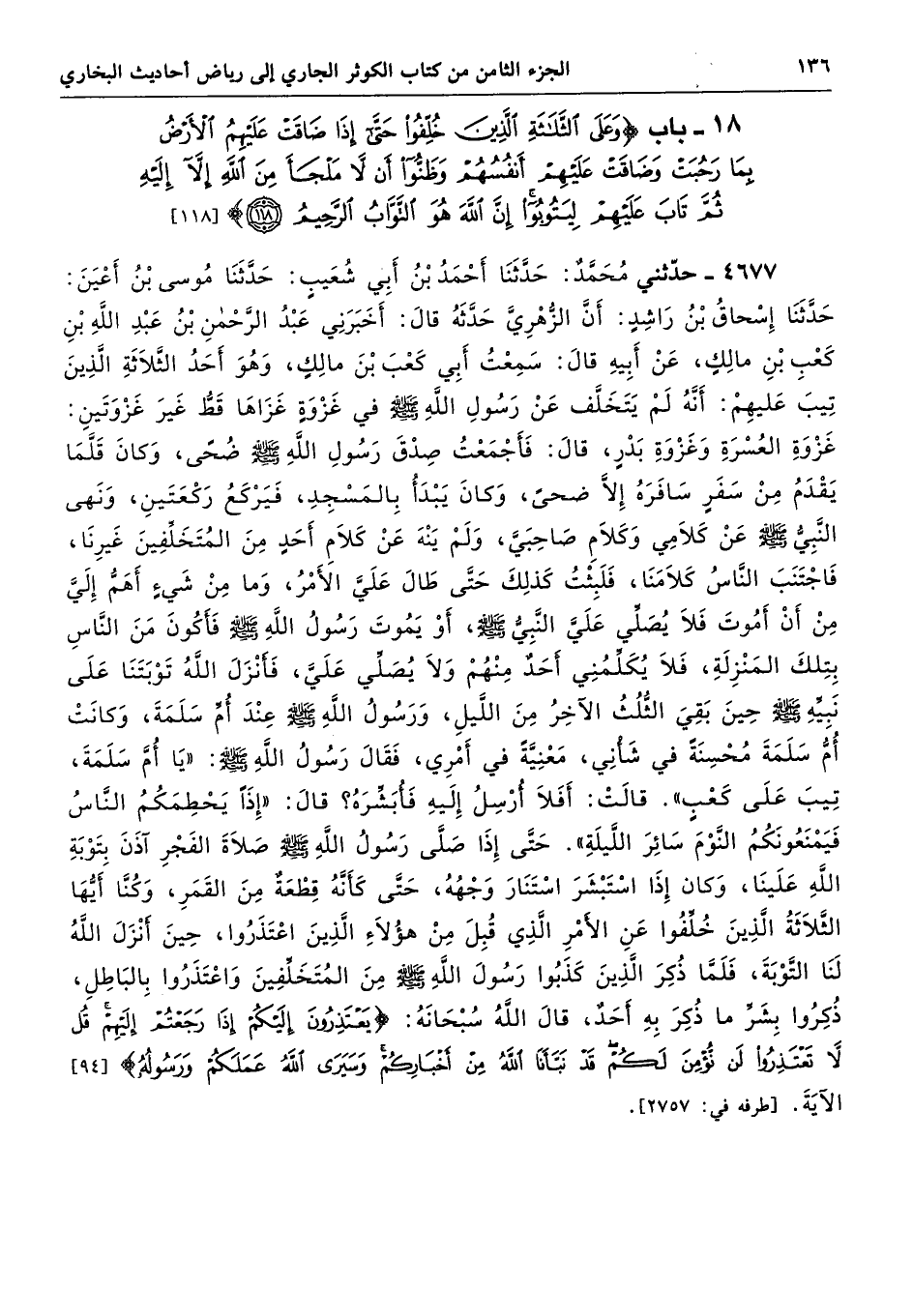4677 - حَدَّثَنِى مُحَمَّدٌ حَدَّثَنَا أَحْمَدُ بْنُ أَبِى شُعَيْبٍ حَدَّثَنَا مُوسَى بْنُ أَعْيَنَ حَدَّثَنَا إِسْحَاقُ بْنُ رَاشِدٍ أَنَّ الزُّهْرِىَّ حَدَّثَهُ قَالَ أَخْبَرَنِى عَبْدُ الرَّحْمَنِ بْنُ عَبْدِ اللَّهِ بْنِ كَعْبِ بْنِ مَالِكٍ عَنْ أَبِيهِ قَالَ سَمِعْتُ أَبِى كَعْبَ بْنَ مَالِكٍ، وَهْوَ أَحَدُ الثَّلاَثَةِ الَّذِينَ تِيبَ عَلَيْهِمْ أَنَّهُ لَمْ يَتَخَلَّفْ عَنْ رَسُولِ اللَّهِ - صلى الله عليه وسلم - فِي غَزْوَةٍ غَزَاهَا قَطُّ غَيْرَ غَزْوَتَيْنِ غَزْوَةِ الْعُسْرَةِ وَغَزْوَةِ بَدْرٍ. قَالَ فَأَجْمَعْتُ صِدْقَ رَسُولِ اللَّهِ - صلى الله عليه وسلم - ضُحًى، وَكَانَ قَلَّمَا يَقْدَمُ مِنْ سَفَرٍ سَافَرَهُ إِلاَّ ضُحًى وَكَانَ يَبْدَأُ بِالْمَسْجِدِ، فَيَرْكَعُ رَكْعَتَيْنِ، وَنَهَى النَّبِىُّ - صلى الله عليه وسلم - عَنْ كَلاَمِى وَكَلاَمِ صَاحِبَىَّ، وَلَمْ يَنْهَ عَنْ كَلاَمِ أَحَدٍ مِنَ الْمُتَخَلِّفِينَ غَيْرِنَا، فَاجْتَنَبَ النَّاسُ كَلاَمَنَا، فَلَبِثْتُ كَذَلِكَ حَتَّى طَالَ عَلَىَّ الأَمْرُ، وَمَا مِنْ شَىْءٍ أَهَمُّ إِلَىَّ مِنْ أَنْ أَمُوتَ فَلاَ يُصَلِّى عَلَىَّ النَّبِىُّ - صلى الله عليه وسلم - أَوْ يَمُوتَ رَسُولُ اللَّهِ - صلى الله عليه وسلم - فَأَكُونَ مِنَ النَّاسِ بِتِلْكَ الْمَنْزِلَةِ، فَلاَ يُكَلِّمُنِى أَحَدٌ مِنْهُمْ، وَلاَ يُصَلِّى عَلَىَّ، فَأَنْزَلَ اللَّهُ تَوْبَتَنَا عَلَى نَبِيِّهِ - صلى الله عليه وسلم - حِينَ بَقِىَ الثُّلُثُ الآخِرُ مِنَ اللَّيْلِ، وَرَسُولُ اللَّهِ - صلى الله عليه وسلم - عِنْدَ أُمِّ سَلَمَةَ، وَكَانَتْ أُمُّ سَلَمَةَ مُحْسِنَةً فِي شَأْنِى مَعْنِيَّةً فِي أَمْرِى، فَقَالَ رَسُولُ اللَّهِ - صلى الله عليه وسلم - «يَا أُمَّ سَلَمَةَ تِيبَ عَلَى كَعْبٍ». قَالَتْ أَفَلاَ أُرْسِلُ إِلَيْهِ فَأُبَشِّرَهُ قَالَ «إِذًا يَحْطِمَكُمُ النَّاسُ فَيَمْنَعُونَكُمُ النَّوْمَ سَائِرَ اللَّيْلَةِ». حَتَّى إِذَا صَلَّى رَسُولُ اللَّهِ - صلى الله عليه وسلم - صَلاَةَ الْفَجْرِ آذَنَ بِتَوْبَةِ اللَّهِ عَلَيْنَا، وَكَانَ إِذَا اسْتَبْشَرَ اسْتَنَارَ وَجْهُهُ حَتَّى كَأَنَّهُ قِطْعَةٌ مِنَ الْقَمَرِ، وَكُنَّا أَيُّهَا الثَّلاَثَةُ الَّذِينَ خُلِّفُوا عَنِ الأَمْرِ الَّذِى قُبِلَ مِنْ هَؤُلاَءِ الَّذِينَ اعْتَذَرُوا حِينَ أَنْزَلَ اللَّهُ لَنَا التَّوْبَةَ، فَلَمَّا ذُكِرَ الَّذِينَ كَذَبُوا رَسُولَ اللَّهِ - صلى الله عليه وسلم - مِنَ الْمُتَخَلِّفِينَ، وَاعْتَذَرُوا بِالْبَاطِلِ، ذُكِرُوا بِشَرِّ مَا ذُكِرَ بِهِ أَحَدٌ قَالَ اللَّهُ سُبْحَانَهُ (يَعْتَذِرُونَ إِلَيْكُمْ إِذَا رَجَعْتُمْ إِلَيْهِمْ قُلْ لاَ تَعْتَذِرُوا لَنْ نُؤْمِنَ لَكُمْ قَدْ نَبَّأَنَا اللَّهُ مِنْ أَخْبَارِكُمْ وَسَيَرَى اللَّهُ عَمَلَكُمْ وَرَسُولُهُ) الآيَةَ. طرفه 2757