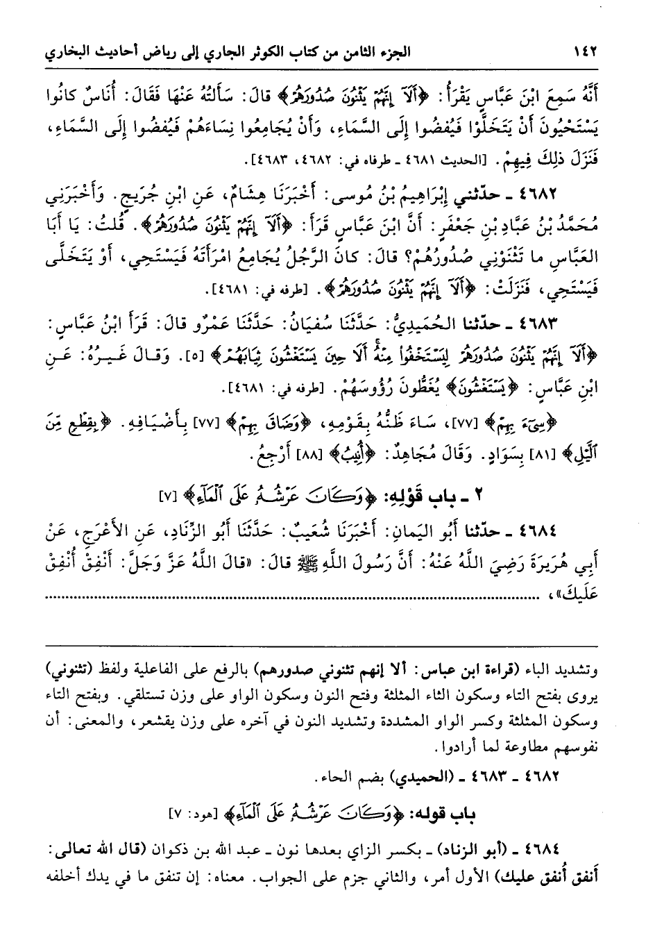 أَنَّهُ سَمِعَ ابْنَ عَبَّاسٍ يَقْرَأُ (أَلاَ إِنَّهُمْ تَثْنَوْنِى صُدُورُهُمْ) قَالَ سَأَلْتُهُ عَنْهَا فَقَالَ أُنَاسٌ كَانُوا يَسْتَحْيُونَ أَنْ يَتَخَلَّوْا فَيُفْضُوا إِلَى السَّمَاءِ، وَأَنْ يُجَامِعُوا نِسَاءَهُمْ فَيُفْضُوا إِلَى السَّمَاءِ، فَنَزَلَ ذَلِكَ فِيهِمْ. طرفاه 4682، 4683