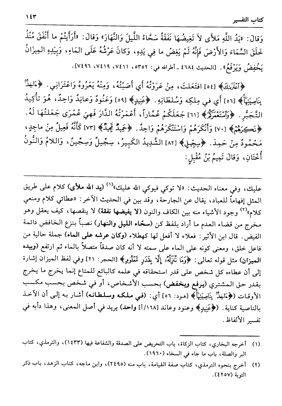 عليك، وفي معناه الحديث: "لا توكي فيوكي الله عليك" (يد الله ملأى) كلام على طريق المثل إفهامًا للعباد، يقال عن الجارحة، وقد بين في الحديث الآخر: "عطائي كلام ومنعي كلام" وجود الأشياء منه بين الكاف والنون (لا يفيضها نفقة) لا ينقصها، كيف يعقل وهو مخرج من قضاء العدم ما أراد بلفظ كن (سحاء الليل والنهار) نصبًا بنزع الخافض دائمة الفيض. قال ابن الأثير: فعلاء لا أفعل لها كهطلاء (وكان عرشه على الماء) جملة حالية من فاعل خلق، ومعنى كونه على الماء على سمته لا أنه كان صدقًا متصلًا بالماء ثم ارتفع (وبيده الميزان) مثل قوله تعالى: {وَمَا نُنَزِّلُهُ إِلَّا بِقَدَرٍ مَعْلُومٍ} [الحجر: 21] وفي لفظ الميزان إشارة إلى أن عطاءه كل شخص على قدر استحقاقه في علمه كالبائع للمتاع إنما يخرج ما يخرج بقدر حق المشتري (يرفع ويخفض) بحسب الأشخاص، أو في شخص بحسب مكسب الأوقات {آخِذٌ بِنَاصِيَتِهَا} [هود: 56] أي: (في ملكه وسلطانه) أشار به إلى أن الآخذ بالناصية كناية. ({عَنِيدٍ} وعنود وعاند واحد) يريد في أصل المعنى، وهذا دأبه في تفسير الألفاظ.