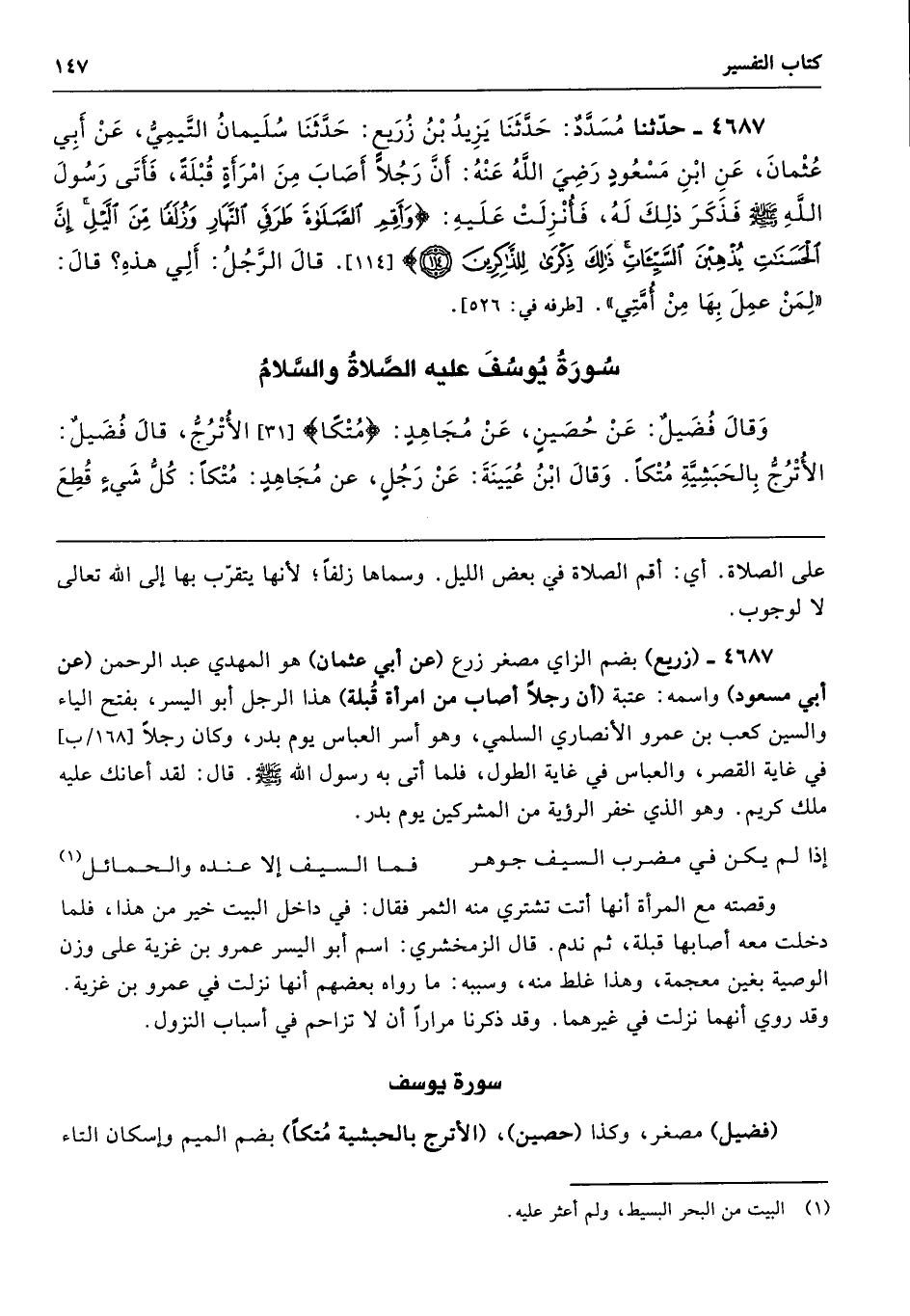 4687 - (زريع) بضم الزاي مصغر زرع (عن أبي عثمان) هو المهدي عبد الرحمن (عن أبي مسعود) واسمه: عتبة (أن رجلًا أصاب من امرأة قُبلة) هذا الرجل أبو اليسر، بفتح الياء والسين كعب بن عمرو الأنصاري السلمي، وهو أسر العباس يوم بدر، وكان رجلًا في غاية القصر، والعباس في غاية الطول، فلما أتى به رسول الله - صلى الله عليه وسلم -. قال: لقد أعانك عليه ملك كريم. وهو الذي خفر الرؤية من المشركين يوم بدر.