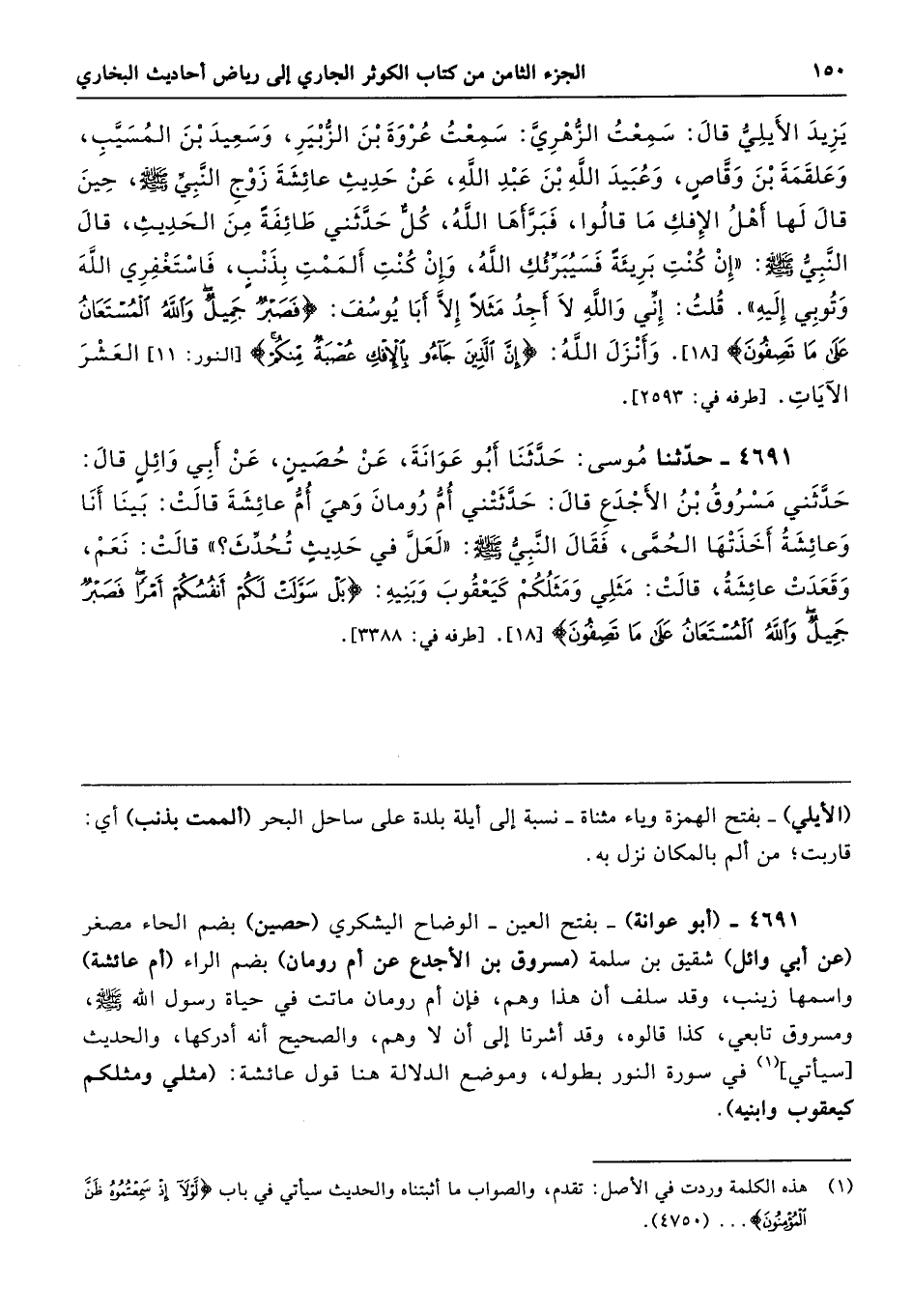 4691 - (أبو عوانة) -بفتح العين- الوضاح اليشكري (حصين) بضم الحاء مصغر (عن أبي وائل) شقيق بن سلمة (مسروق بن الأجدع عن أم رومان) بضم الراء (أم عائشة) واسمها زينب، وقد سلف أن هذا وهم، فإن أم رومان ماتت في حياة رسول الله - صلى الله عليه وسلم -، ومسروق تابعي، كذا قالوه، وقد أشرنا إلى أن لا وهم، والصحيح أنه أدركها، والحديث [سيأتي] في سورة النور بطوله، وموضع الدلالة هنا قول عائشة: (مثلي ومثلكم كيعقوب وابنيه).