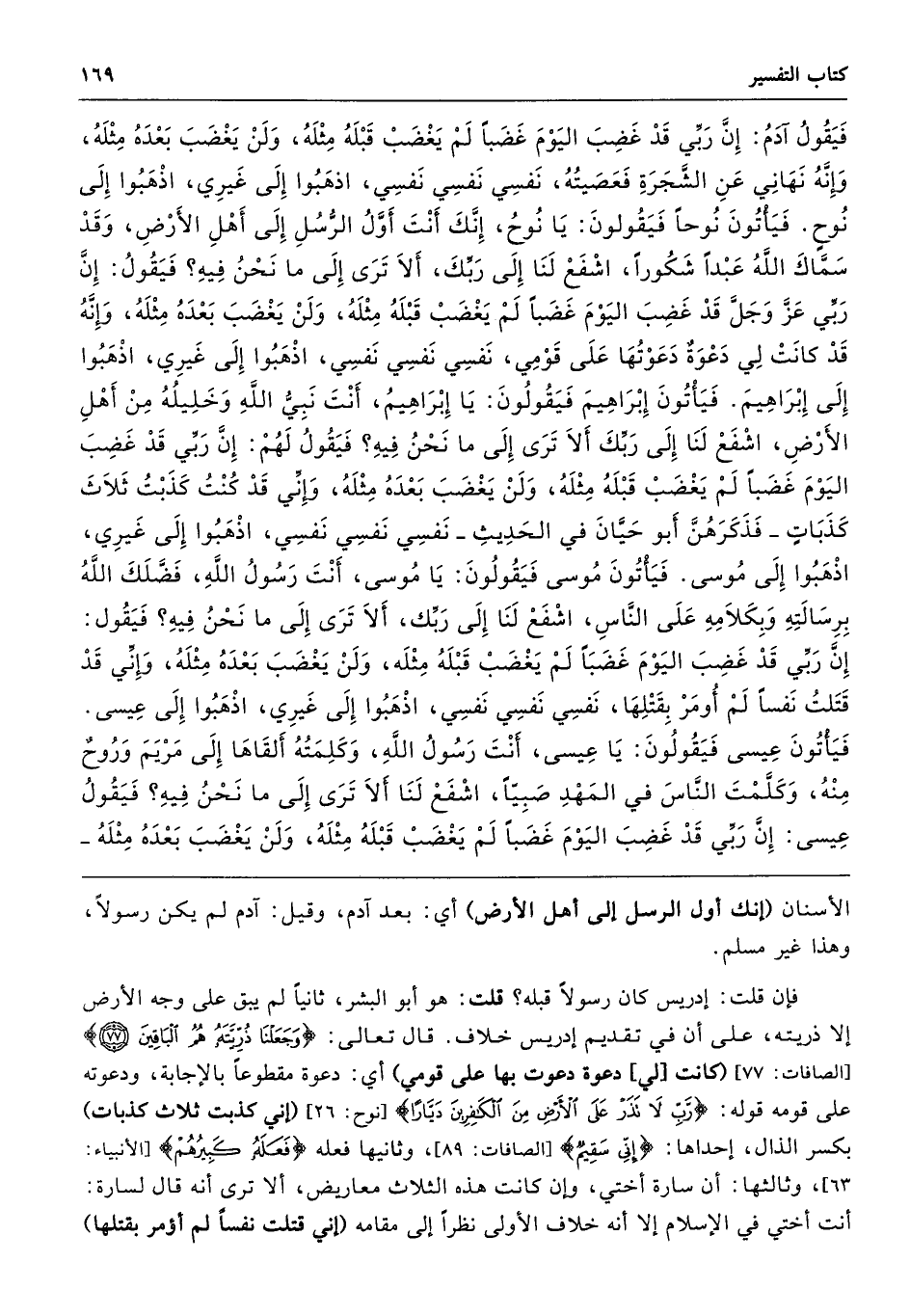 فَيَقُولُ آدَمُ إِنَّ رَبِّى قَدْ غَضِبَ الْيَوْمَ غَضَبًا لَمْ يَغْضَبْ قَبْلَهُ مِثْلَهُ وَلَنْ يَغْضَبَ بَعْدَهُ مِثْلَهُ، وَإِنَّهُ نَهَانِى عَنِ الشَّجَرَةِ فَعَصَيْتُهُ، نَفْسِى نَفْسِى نَفْسِى، اذْهَبُوا إِلَى غَيْرِى، اذْهَبُوا إِلَى نُوحٍ، فَيَأْتُونَ نُوحًا فَيَقُولُونَ يَا نُوحُ إِنَّكَ أَنْتَ أَوَّلُ الرُّسُلِ إِلَى أَهْلِ الأَرْضِ، وَقَدْ سَمَّاكَ اللَّهُ عَبْدًا شَكُورًا اشْفَعْ لَنَا إِلَى رَبِّكَ، أَلاَ تَرَى إِلَى مَا نَحْنُ فِيهِ فَيَقُولُ إِنَّ رَبِّى عَزَّ وَجَلَّ قَدْ غَضِبَ الْيَوْمَ غَضَبًا لَمْ يَغْضَبْ قَبْلَهُ مِثْلَهُ، وَلَنْ يَغْضَبَ بَعْدَهُ مِثْلَهُ، وَإِنَّهُ قَدْ كَانَتْ لِى دَعْوَةٌ دَعَوْتُهَا عَلَى قَوْمِى نَفْسِى نَفْسِى نَفْسِى اذْهَبُوا إِلَى غَيْرِى، اذْهَبُوا إِلَى إِبْرَاهِيمَ، فَيَأْتُونَ إِبْرَاهِيمَ، فَيَقُولُونَ يَا إِبْرَاهِيمُ، أَنْتَ نَبِىُّ اللَّهِ وَخَلِيلُهُ مِنْ أَهْلِ الأَرْضِ اشْفَعْ لَنَا إِلَى رَبِّكَ أَلاَ تَرَى إِلَى مَا نَحْنُ فِيهِ فَيَقُولُ لَهُمْ إِنَّ رَبِّى قَدْ غَضِبَ الْيَوْمَ غَضَبًا لَمْ يَغْضَبْ قَبْلَهُ مِثْلَهُ وَلَنْ يَغْضَبَ بَعْدَهُ مِثْلَهُ، وَإِنِّى قَدْ كُنْتُ كَذَبْتُ ثَلاَثَ كَذَبَاتٍ - فَذَكَرَهُنَّ أَبُو حَيَّانَ فِي الْحَدِيثِ - نَفْسِى نَفْسِى نَفْسِى، اذْهَبُوا إِلَى غَيْرِى اذْهَبُوا إِلَى مُوسَى، فَيَأْتُونَ مُوسَى، فَيَقُولُونَ يَا مُوسَى أَنْتَ رَسُولُ اللَّهِ، فَضَّلَكَ اللَّهُ بِرِسَالَتِهِ وَبِكَلاَمِهِ عَلَى النَّاسِ، اشْفَعْ لَنَا إِلَى رَبِّكَ أَلاَ تَرَى إِلَى مَا نَحْنُ فِيهِ فَيَقُولُ إِنَّ رَبِّى قَدْ غَضِبَ الْيَوْمَ غَضَبًا لَمْ يَغْضَبْ قَبْلَهُ مِثْلَهُ، وَلَنْ يَغْضَبَ بَعْدَهُ مِثْلَهُ، وَإِنِّى قَدْ قَتَلْتُ نَفْسًا لَمْ أُومَرْ بِقَتْلِهَا، نَفْسِى نَفْسِى نَفْسِى، اذْهَبُوا إِلَى غَيْرِى، اذْهَبُوا إِلَى عِيسَى، فَيَأْتُونَ عِيسَى فَيَقُولُونَ يَا عِيسَى أَنْتَ رَسُولُ اللَّهِ وَكَلِمَتُهُ أَلْقَاهَا إِلَى مَرْيَمَ وَرُوحٌ مِنْهُ، وَكَلَّمْتَ النَّاسَ فِي الْمَهْدِ صَبِيًّا اشْفَعْ لَنَا أَلاَ تَرَى إِلَى مَا نَحْنُ فِيهِ فَيَقُولُ عِيسَى إِنَّ رَبِّى قَدْ غَضِبَ الْيَوْمَ غَضَبًا لَمْ يَغْضَبْ قَبْلَهُ مِثْلَهُ، وَلَنْ يَغْضَبَ بَعْدَهُ مِثْلَهُ