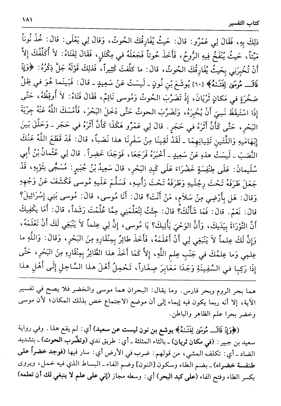 ({وَإِذْ قَالَ مُوسَى لِفَتَاهُ} يوشع بن نون ليست عن سعيد) أي: لم يقع هذا. وفي رواية سعيد بن جبير: (في مكان ثريان) -بالثاء المثلثة- أي: طريق ندي (وتضَّرب الحوت) -بتشديد الضاد- أي: تكلف المشي، من قولهم: ضرب في الأرض أي: سار فيها (فوجد خضرًا على طنفسة خضراء) -بضم الطاء وسكون [النون] وضم الفاء- البساط الذي فيه خمل، ويروى بكسر الطاء وفتح الفاء (على كبد البحر) أي: وسطه مجاز (إنِّي على علم لا ينبغي لك أن تعلمه)