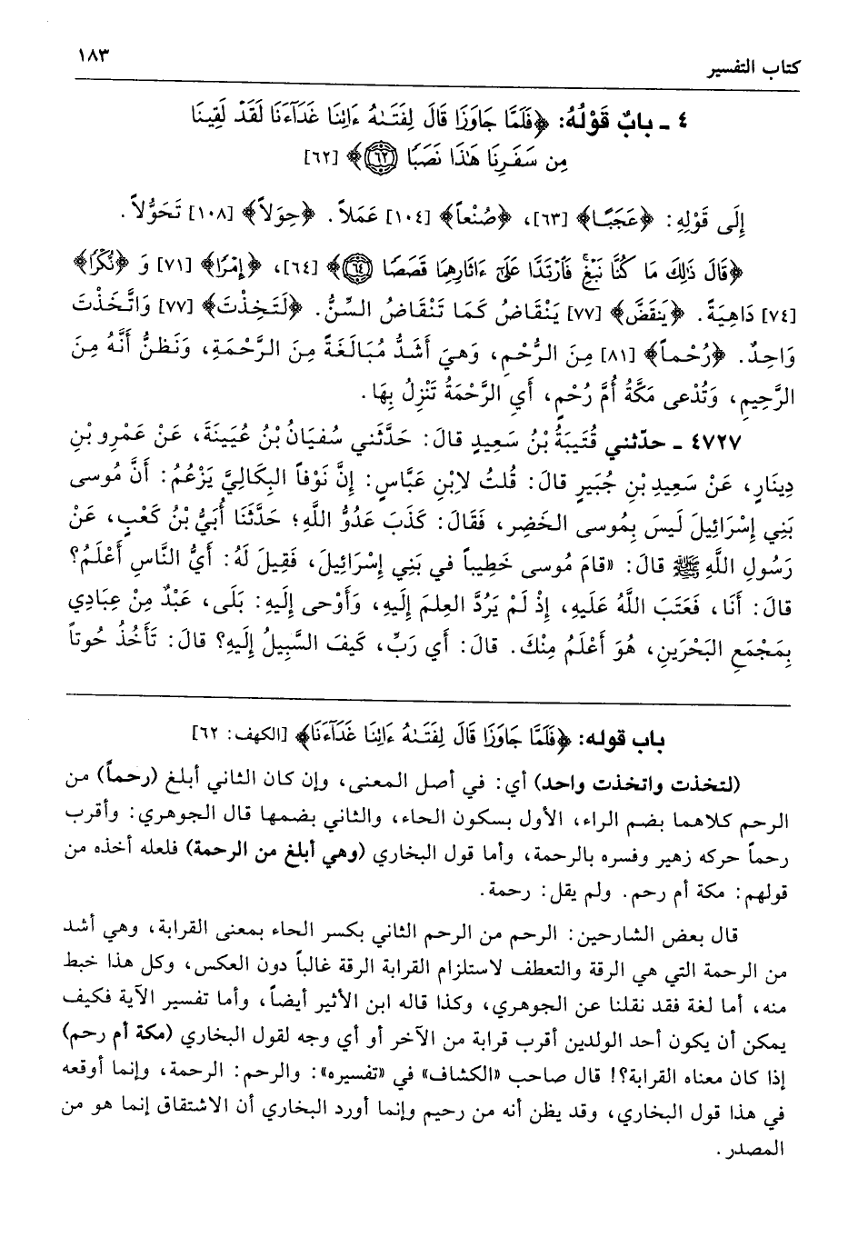 4727 - حَدَّثَنِى قُتَيْبَةُ بْنُ سَعِيدٍ قَالَ حَدَّثَنِى سُفْيَانُ بْنُ عُيَيْنَةَ عَنْ عَمْرِو بْنِ دِينَارٍ عَنْ سَعِيدِ بْنِ جُبَيْرٍ قَالَ قُلْتُ لاِبْنِ عَبَّاسٍ إِنَّ نَوْفًا الْبَكَالِىَّ يَزْعُمُ أَنَّ مُوسَى بَنِى إِسْرَائِيلَ لَيْسَ بِمُوسَى الْخَضِرِ. فَقَالَ كَذَبَ عَدُوُّ اللَّهِ حَدَّثَنَا أُبَىُّ بْنُ كَعْبٍ عَنْ رَسُولِ اللَّهِ - صلى الله عليه وسلم - قَالَ «قَامَ مُوسَى خَطِيبًا فِي بَنِى إِسْرَائِيلَ فَقِيلَ لَهُ أَىُّ النَّاسِ أَعْلَمُ قَالَ أَنَا، فَعَتَبَ اللَّهُ عَلَيْهِ، إِذْ لَمْ يَرُدَّ الْعِلْمَ إِلَيْهِ، وَأَوْحَى إِلَيْهِ بَلَى عَبْدٌ مِنْ عِبَادِى بِمَجْمَعِ الْبَحْرَيْنِ، هُوَ أَعْلَمُ مِنْكَ قَالَ أَىْ رَبِّ كَيْفَ السَّبِيلُ إِلَيْهِ قَالَ تَأْخُذُ حُوتًا
