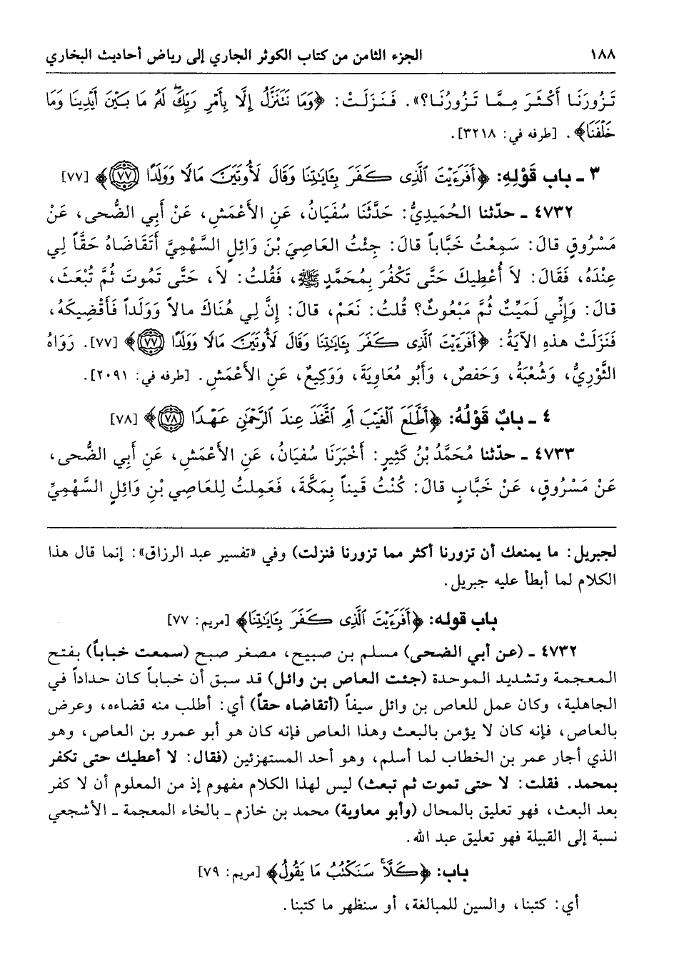 4732 - (عن أبي الضحى) مسلم بن صبيح، مصغر صبح (سمعت خبابًا) بفتح المعجمة وتشديد الموحدة (جئت العاص بن وائل) قد سبق أن خبابًا كان حدادًا في الجاهلية، وكان عمل للعاص بن وائل سيفًا (أتقاضاه حقًّا) أي: أطلب منه قضاءه، وعرض بالعاص، فإنَّه كان لا يؤمن بالبعث وهذا العاص فإنَّه كان هو أبو عمرو بن العاص، وهو الذي أجار عمر بن الخَطَّاب لما أسلم، وهو أحد المستهزئين (فقال: لا أعطيك حتَّى تكفر بمحمد. فقلت: لا حتَّى تموت ثم تبعث) ليس لهذا الكلام مفهوم إذ من المعلوم أن لا كفر بعد البعث، فهو تعليق بالمحال (وأبو معاوية) محمَّد بن خازم -بالخاء المعجمة- الأَشجعيّ نسبة إلى القبيلة فهو تعليق عبد الله.