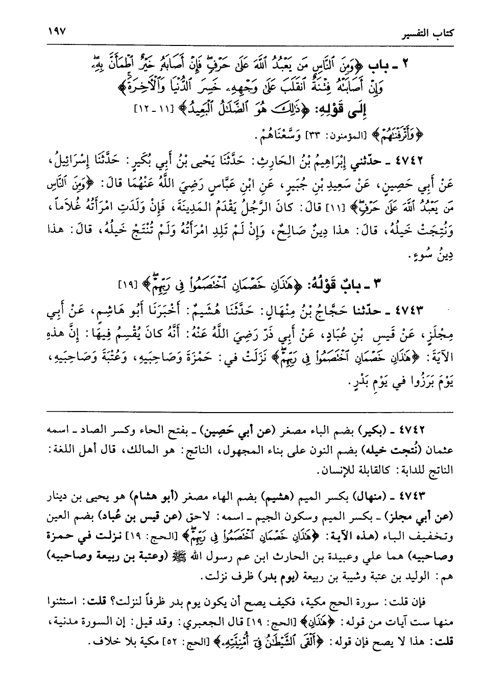 4743 - (منهال) بكسر الميم (هشيم) بضم الهاء مصغر (أبو هشام) هو يحيى بن دينار (عن أبي مجلز) -بكسر الميم وسكون الجيم- اسمه: لاحق (عن قيس بن عُباد) بضم العين وتخفيف الباء (هذه الآية: {هَذَانِ خَصْمَانِ اخْتَصَمُوا فِي رَبِّهِمْ} [الحج: 19] نزلت في حمزة وصاحبيه) هما علي وعبيدة بن الحارث ابن عم رسول الله- صلى الله عليه وسلم - (وعتبة بن ربيعة وصاحبيه) هم: الوليد بن عتبة وشيبة بن ربيعة (يوم بدر) ظرف نزلت.