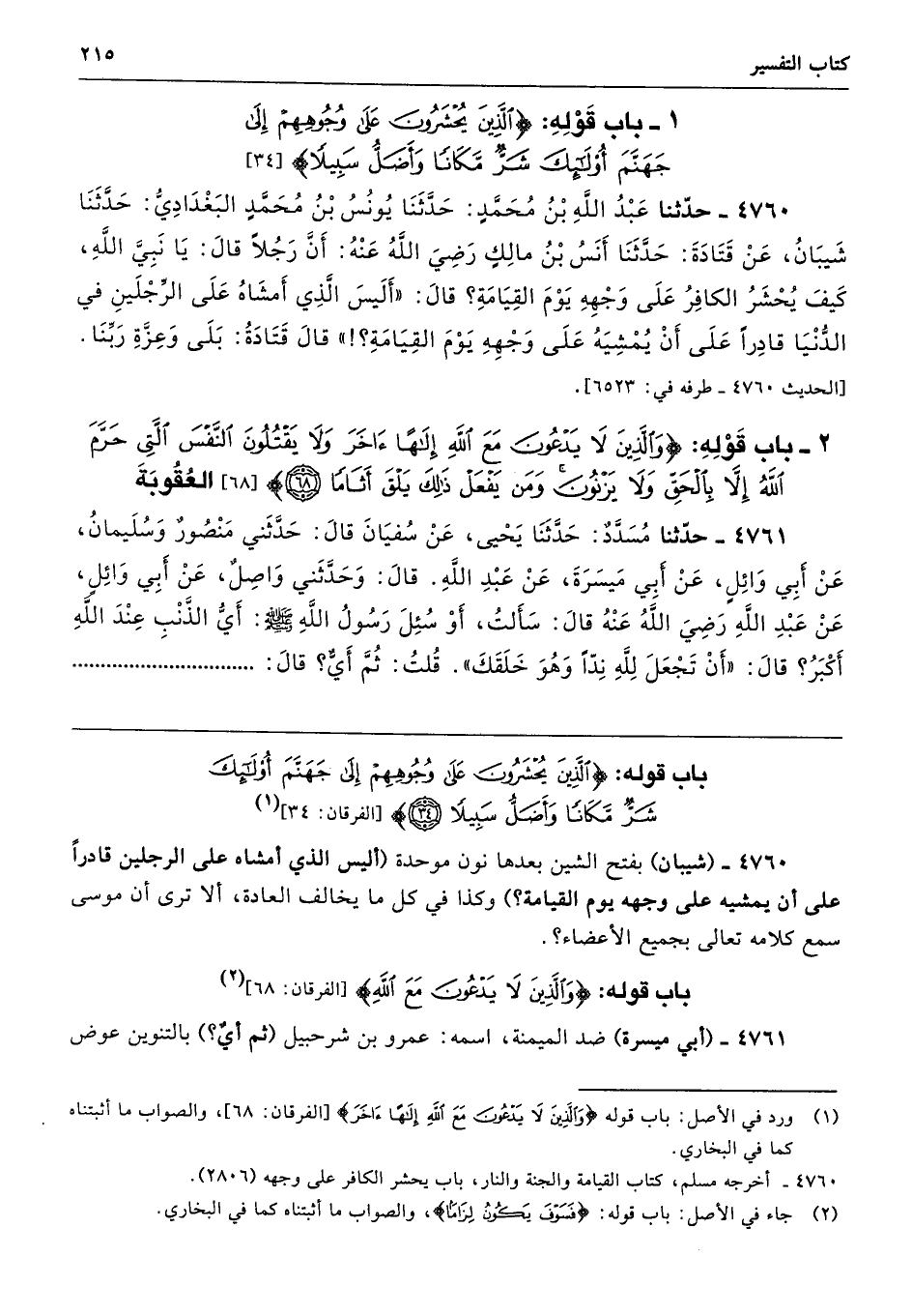 1 - باب قَوْلِهِ (الَّذِينَ يُحْشَرُونَ عَلَى وُجُوهِهِمْ إِلَى جَهَنَّمَ أُولَئِكَ شَرٌّ مَكَانًا وَأَضَلُّ سَبِيلاً)