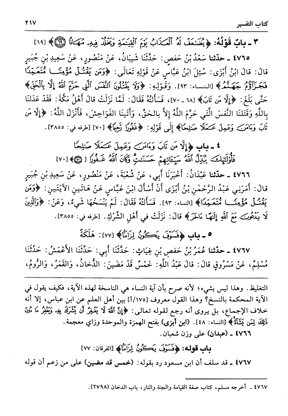 التغليظ. وهذا ليس بشيء؛ لأنَّه صرح بأن آية النساء هي الناسخة لهذه الآية، فكيف يقول في الآية المحكمة بالنسخ؟ وهذا القول معروف بين أهل العلم عن ابن عباس، إلَّا أنَّه خلاف الإجماع، بل يروى أنه رجع لقوله تعالى: {إِنَّ اللَّهَ لَا يَغْفِرُ أَنْ يُشْرَكَ بِهِ وَيَغْفِرُ مَا دُونَ ذَلِكَ لِمَنْ يَشَاءُ} [النساء: 48]. (ابن أبزى) بفتح الهمزة والموحدة وزاي معجمة.