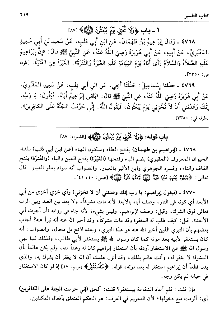 4769 - حَدَّثَنَا إِسْمَاعِيلُ حَدَّثَنَا أَخِى عَنِ ابْنِ أَبِى ذِئْبٍ عَنْ سَعِيدٍ الْمَقْبُرِىِّ عَنْ أَبِى هُرَيْرَةَ - رضى الله عنه - عَنِ النَّبِيِّ - صلى الله عليه وسلم - قَالَ «يَلْقَى إِبْرَاهِيمُ أَبَاهُ فَيَقُولُ يَا رَبِّ إِنَّكَ وَعَدْتَنِى أَنْ لاَ تُخْزِنِى يَوْمَ يُبْعَثُونَ فَيَقُولُ اللَّهُ إِنِّى حَرَّمْتُ الْجَنَّةَ عَلَى الْكَافِرِينَ». طرفه 3350