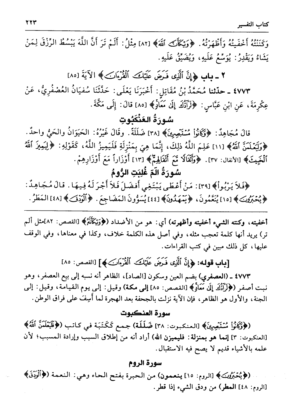 4773 - (العصفري) بضم العين وسكون [الصاد]، الظاهر أنَّه نسبه إلى بيع العصفر، وهو نبت أصفر ({لَرَادُّكَ إِلَى مَعَادٍ} [القصص: 85] إلى مكّة) وقيل: إلى يوم القيامة، وقيل: إلى الجنَّة، والأول هو الظاهر، فإن الآية نزلت بالجحفة بعد الهجرة لما أسِفَ على فراق الوطن.