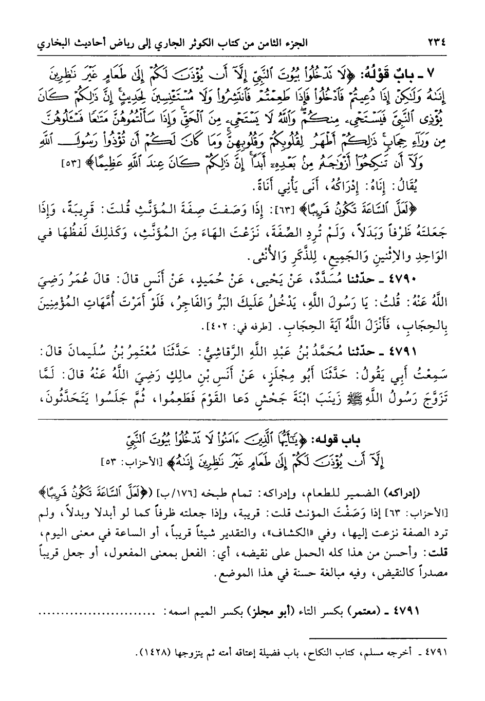 باب قوله: {يَاأَيُّهَا الَّذِينَ آمَنُوا لَا تَدْخُلُوا بُيُوتَ النَّبِيِّ إِلَّا أَنْ يُؤْذَنَ لَكُمْ إِلَى طَعَامٍ غَيْرَ نَاظِرِينَ إِنَاهُ} [الأحزاب: 53]