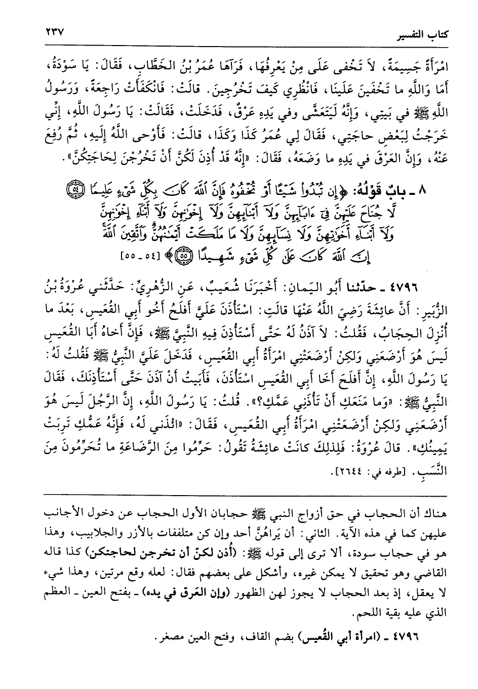 4796 - حَدَّثَنَا أَبُو الْيَمَانِ أَخْبَرَنَا شُعَيْبٌ عَنِ الزُّهْرِىِّ حَدَّثَنِى عُرْوَةُ بْنُ الزُّبَيْرِ أَنَّ عَائِشَةَ - رضى الله عنها - قَالَتِ اسْتَأْذَنَ عَلَىَّ أَفْلَحُ أَخُو أَبِى الْقُعَيْسِ بَعْدَ مَا أُنْزِلَ الْحِجَابُ، فَقُلْتُ لاَ آذَنُ لَهُ حَتَّى أَسْتَأْذِنَ فِيهِ النَّبِىَّ - صلى الله عليه وسلم - فَإِنَّ أَخَاهُ أَبَا الْقُعَيْسِ لَيْسَ هُوَ أَرْضَعَنِى، وَلَكِنْ أَرْضَعَتْنِى امْرَأَةُ أَبِى الْقُعَيْسِ، فَدَخَلَ عَلَىَّ النَّبِىُّ - صلى الله عليه وسلم - فَقُلْتُ لَهُ يَا رَسُولَ اللَّهِ، إِنَّ أَفْلَحَ أَخَا أَبِى الْقُعَيْسِ اسْتَأْذَنَ، فَأَبَيْتُ أَنْ آذَنَ حَتَّى أَسْتَأْذِنَكَ فَقَالَ النَّبِىُّ - صلى الله عليه وسلم - «وَمَا مَنَعَكِ أَنْ تَأْذَنِى عَمُّكِ». قُلْتُ يَا رَسُولَ اللَّهِ إِنَّ الرَّجُلَ لَيْسَ هُوَ أَرْضَعَنِى، وَلَكِنْ أَرْضَعَتْنِى امْرَأَةُ أَبِى الْقُعَيْسِ. فَقَالَ «ائْذَنِى لَهُ فَإِنَّهُ عَمُّكِ، تَرِبَتْ يَمِينُكِ». قَالَ عُرْوَةُ فَلِذَلِكَ كَانَتْ عَائِشَةُ تَقُولُ حَرِّمُوا مِنَ الرَّضَاعَةِ مَا تُحَرِّمُونَ مِنَ النَّسَبِ. طرفه 2644
