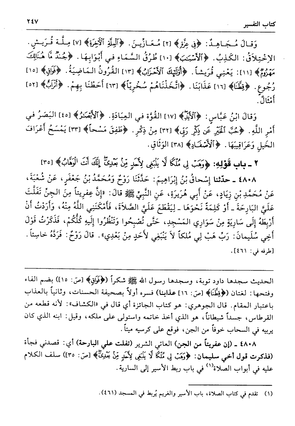 4808 - حَدَّثَنَا إِسْحَاقُ بْنُ إِبْرَاهِيمَ حَدَّثَنَا رَوْحٌ وَمُحَمَّدُ بْنُ جَعْفَرٍ عَنْ شُعْبَةَ عَنْ مُحَمَّدِ بْنِ زِيَادٍ عَنْ أَبِى هُرَيْرَةَ عَنِ النَّبِيِّ - صلى الله عليه وسلم - قَالَ «إِنَّ عِفْرِيتًا مِنَ الْجِنِّ تَفَلَّتَ عَلَىَّ الْبَارِحَةَ - أَوْ كَلِمَةً نَحْوَهَا - لِيَقْطَعَ عَلَىَّ الصَّلاَةَ، فَأَمْكَنَنِى اللَّهُ مِنْهُ وَأَرَدْتُ أَنْ أَرْبِطَهُ إِلَى سَارِيَةٍ مِنْ سَوَارِى الْمَسْجِدِ حَتَّى تُصْبِحُوا وَتَنْظُرُوا إِلَيْهِ كُلُّكُمْ، فَذَكَرْتُ قَوْلَ أَخِى سُلَيْمَانَ رَبِّ هَبْ لِى مُلْكًا لاَ يَنْبَغِى لأَحَدٍ مِنْ بَعْدِى». قَالَ رَوْحٌ فَرَدَّهُ خَاسِئًا. طرفه 461
