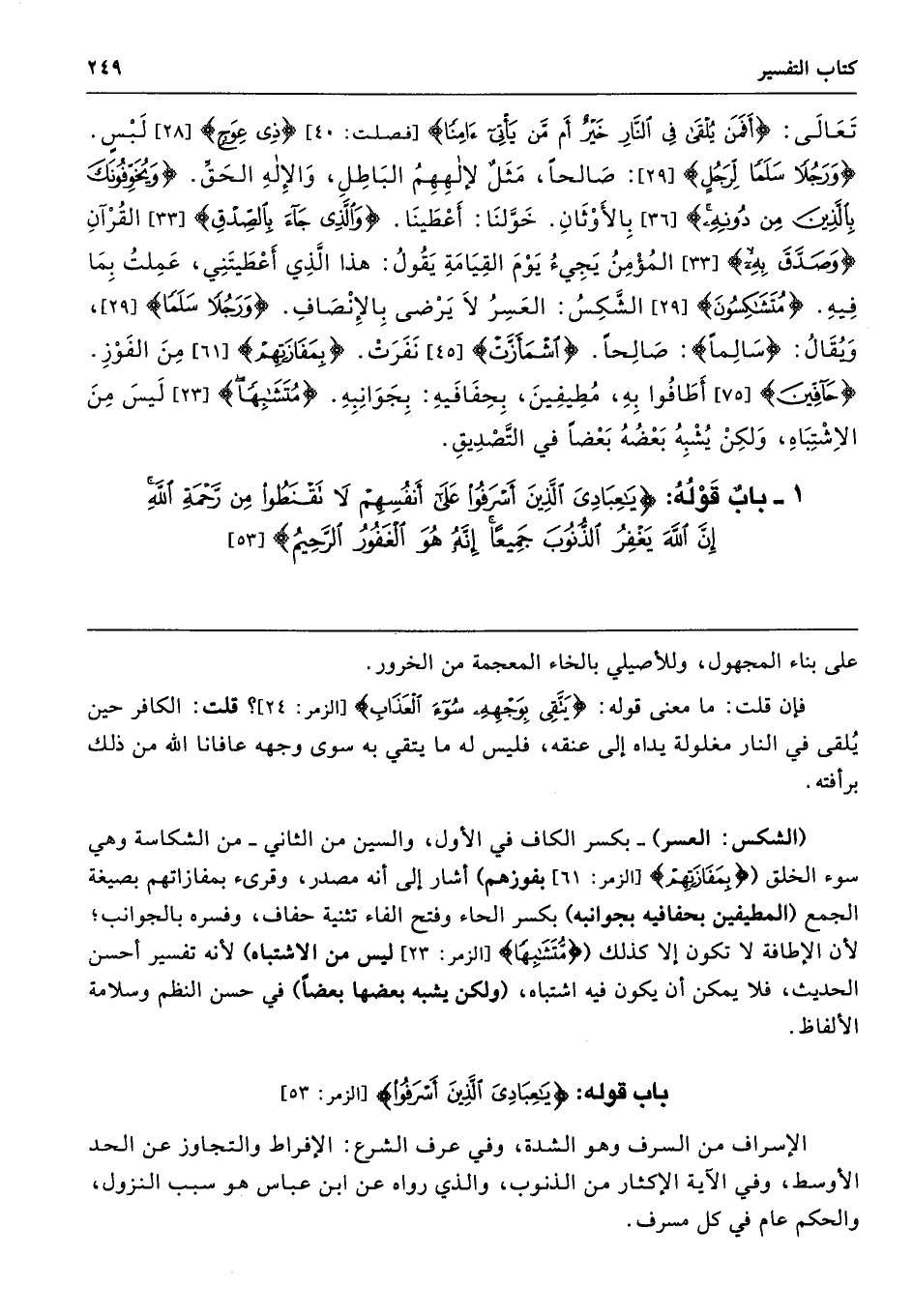 1 - باب قَوْلِهِ (يَا عِبَادِىَ الَّذِينَ أَسْرَفُوا عَلَى أَنْفُسِهِمْ لاَ تَقْنَطُوا مِنْ رَحْمَةِ اللَّهِ إِنَّ اللَّهَ يَغْفِرُ الذُّنُوبَ جَمِيعًا إِنَّهُ هُوَ الْغَفُورُ الرَّحِيمُ)