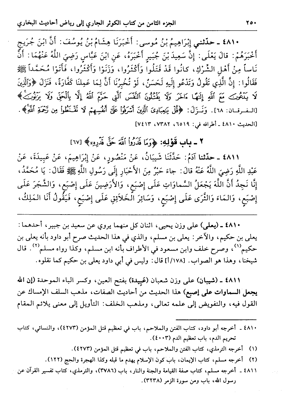 4811 - (شيبان) على وزن شعبان (عَبِيدة) بفتح العين، وكسر الباء الموحدة (إن الله يجعل السماوات على إصبع) هذا الحديث من أحاديث الصفات، مذهب السلف الإمساك عن القول فيه، والتفويض إلى علمه تعالى، ومذهب الخلف: التأويل إلى معنى يلائم المقام
