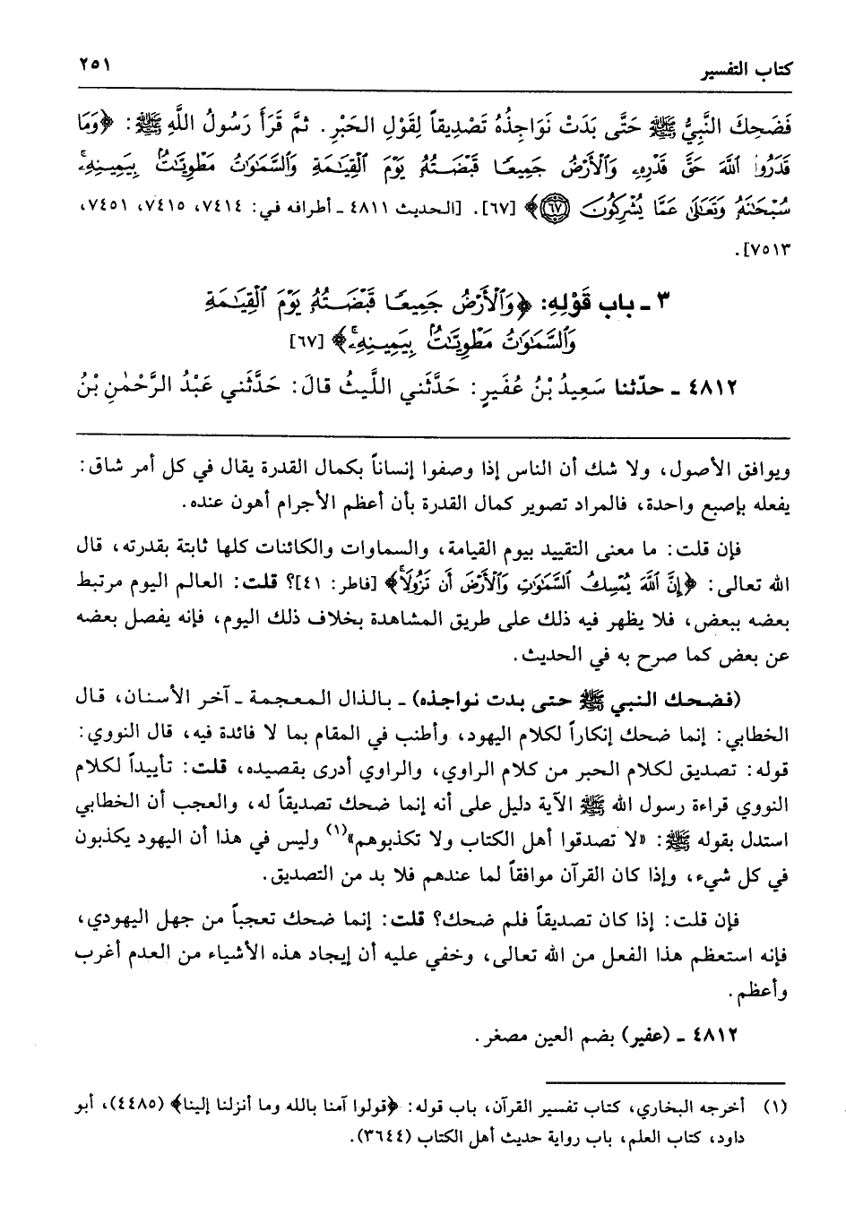 فَضَحِكَ النَّبِىُّ - صلى الله عليه وسلم - حَتَّى بَدَتْ نَوَاجِذُهُ تَصْدِيقًا لِقَوْلِ الْحَبْرِ ثُمَّ قَرَأَ رَسُولُ اللَّهِ - صلى الله عليه وسلم - (وَمَا قَدَرُوا اللَّهَ حَقَّ قَدْرِهِ وَالأَرْضُ جَمِيعًا قَبْضَتُهُ يَوْمَ الْقِيَامَةِ وَالسَّمَوَاتُ مَطْوِيَّاتٌ بِيَمِينِهِ سُبْحَانَهُ وَتَعَالَى عَمَّا يُشْرِكُونَ). أطرافه 7414، 7415، 7451، 7513