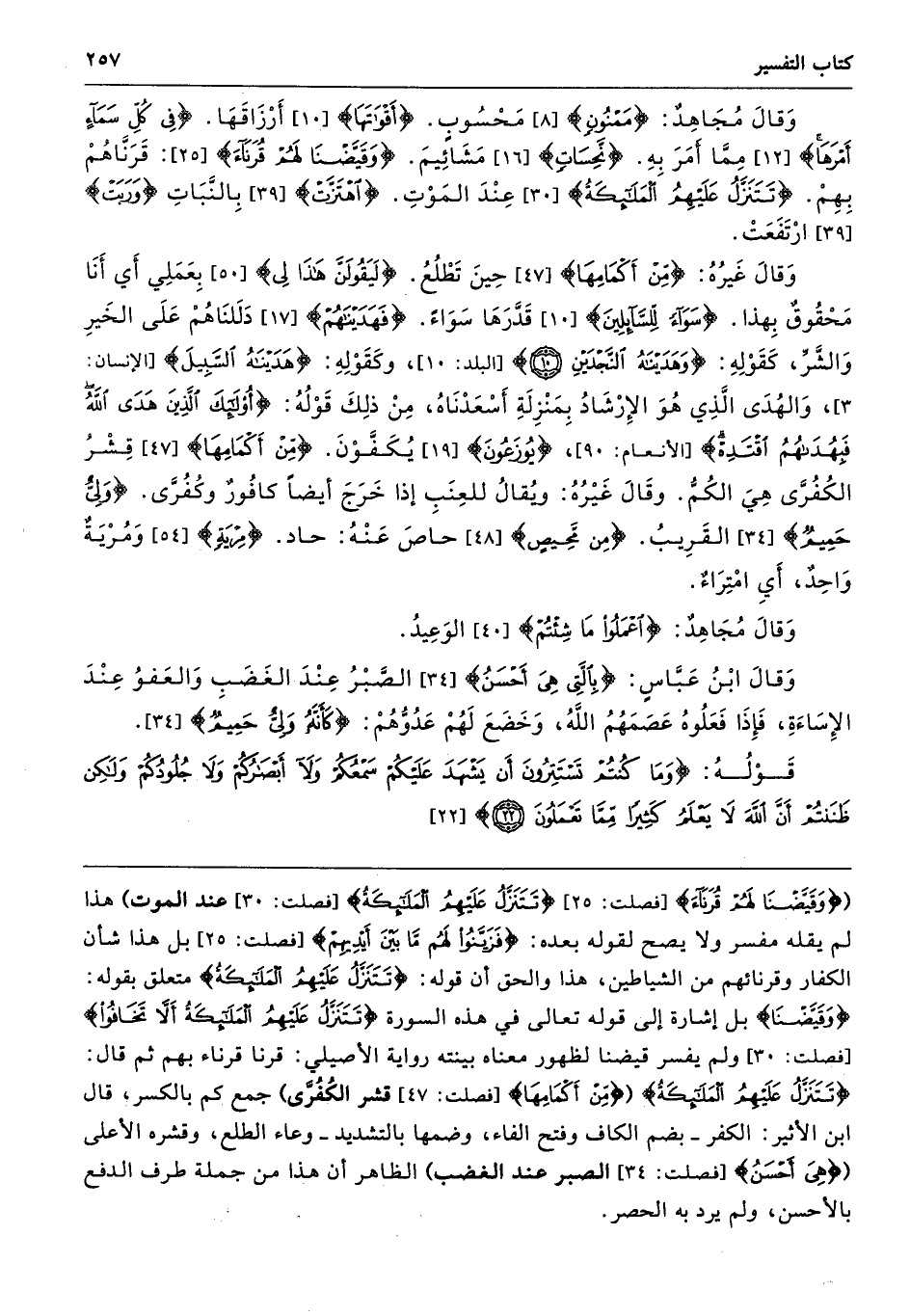 {وَقَيَّضْنَا لَهُمْ قُرَنَاءَ} [فصلت: 25] {تَتَنَزَّلُ عَلَيْهِمُ الْمَلَائِكَةُ} [فصلت: 30] عند الموت) هذا لم يقله مفسر ولا يصح لقوله بعده: {فَزَيَّنُوا لَهُمْ مَا بَيْنَ أَيْدِيهِمْ} [فصلت: 25] بل هذا شأن الكفار وقرنائهم من الشياطين، هذا والحق أن قوله: {تَتَنَزَّلُ عَلَيْهِمُ الْمَلَائِكَةُ} متعلق بقوله: {وَقَيَّضْنَا} بل إشارة إلى قوله تعالى في هذه السورة {تَتَنَزَّلُ عَلَيْهِمُ الْمَلَائِكَةُ أَلَّا تَخَافُوا} [فصلت: 30] ولم يفسر قيضنا لظهور معناه بينته رواية الأصيلي: قرنا قرناء بهم ثم قال: {تَتَنَزَّلُ عَلَيْهِمُ الْمَلَائِكَةُ} ({مِنْ أَكْمَامِهَا} [فصلت: 47] قشر الكُفُرَّى) جمع كم بالكسر، قال ابن الأثير: الكفر -بضم الكاف وفتح الفاء، وضمها بالتشديد- وعاء الطلع، وقشره الأعلى ({هِيَ أَحْسَنُ} [فصلت: 34] الصبر عند الغضب) الظاهر أن هذا من جملة طرف الدفع بالأحسن، ولم يرد به الحصر.