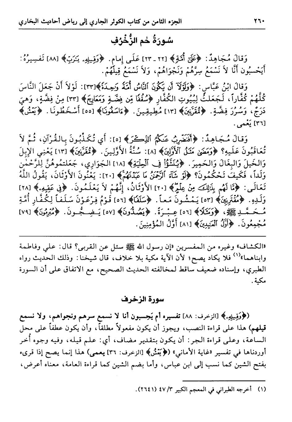 ({وَقِيلِهِ} [الزخرف: 88] تفسيره أم يَحِسبون أنا لا نسمع سرهم ونجواهم، ولا نسمع قيلهم) هذا على قراءة النصب، ويجوز أن يكون مفعولًا مطلقًا، وأن يكون عطفًا على محل الساعة، وعلى قراءة الجر: أن يكون بتقدير مضاف، أي: علم قيله، وفيه وجوه أُخر أوردناها في تفسير "غاية الأماني" ({يَعْشُ} [الزخرف: 36] يعمى) هذا إنما يصح إذا قرئ بفتح الشين كما نسب إلى ابن عباس، وأما بضم الشين كما قراءة العامة، معناه أعرض،