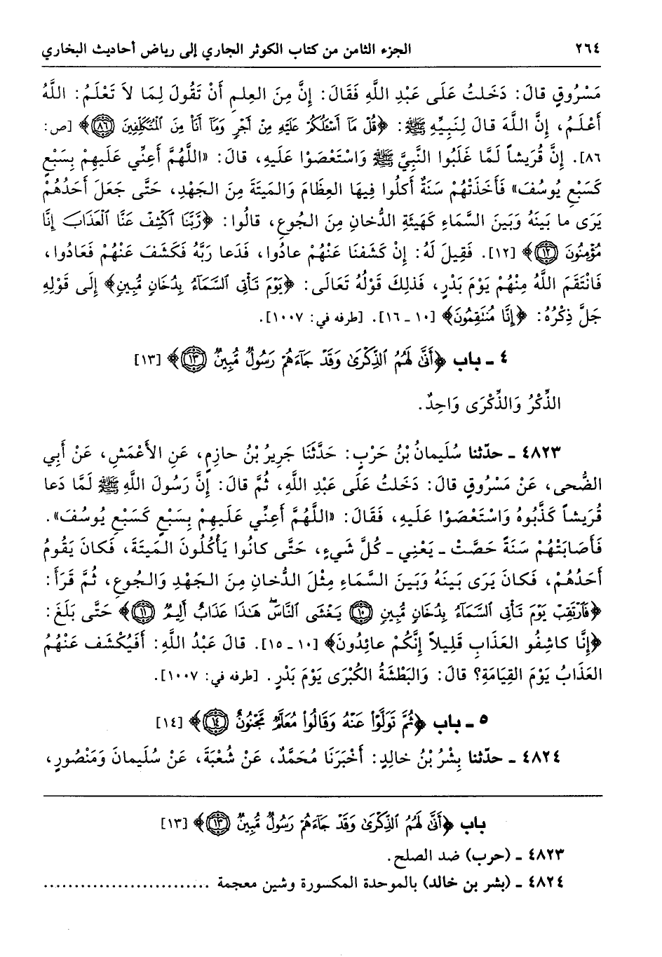 مَسْرُوقٍ قَالَ دَخَلْتُ عَلَى عَبْدِ اللَّهِ فَقَالَ إِنَّ مِنَ الْعِلْمِ أَنْ تَقُولَ لِمَا لاَ تَعْلَمُ اللَّهُ أَعْلَمُ، إِنَّ اللَّهَ قَالَ لِنَبِيِّهِ - صلى الله عليه وسلم - (قُلْ مَا أَسْأَلُكُمْ عَلَيْهِ مِنْ أَجْرٍ وَمَا أَنَا مِنَ الْمُتَكَلِّفِينَ) إِنَّ قُرَيْشًا لَمَّا غَلَبُوا النَّبِىَّ - صلى الله عليه وسلم - وَاسْتَعْصَوْا عَلَيْهِ قَالَ «اللَّهُمَّ أَعِنِّى عَلَيْهِمْ بِسَبْعٍ كَسَبْعِ يُوسُفَ». فَأَخَذَتْهُمْ سَنَةٌ أَكَلُوا فِيهَا الْعِظَامَ وَالْمَيْتَةَ مِنَ الْجَهْدِ، حَتَّى جَعَلَ أَحَدُهُمْ يَرَى مَا بَيْنَهُ وَبَيْنَ السَّمَاءِ كَهَيْئَةِ الدُّخَانِ مِنَ الْجُوعِ. قَالُوا (رَبَّنَا اكْشِفْ عَنَّا الْعَذَابَ إِنَّا مُؤْمِنُونَ) فَقِيلَ لَهُ إِنْ كَشَفْنَا عَنْهُمْ عَادُوا. فَدَعَا رَبَّهُ فَكَشَفَ عَنْهُمْ، فَعَادُوا، فَانْتَقَمَ اللَّهُ مِنْهُمْ يَوْمَ بَدْرٍ، فَذَلِكَ قَوْلُهُ تَعَالَى (يَوْمَ تَأْتِى السَّمَاءُ بِدُخَانٍ مُبِينٍ) إِلَى قَوْلِهِ جَلَّ ذِكْرُهُ (إِنَّا مُنْتَقِمُونَ) طرفه 1007