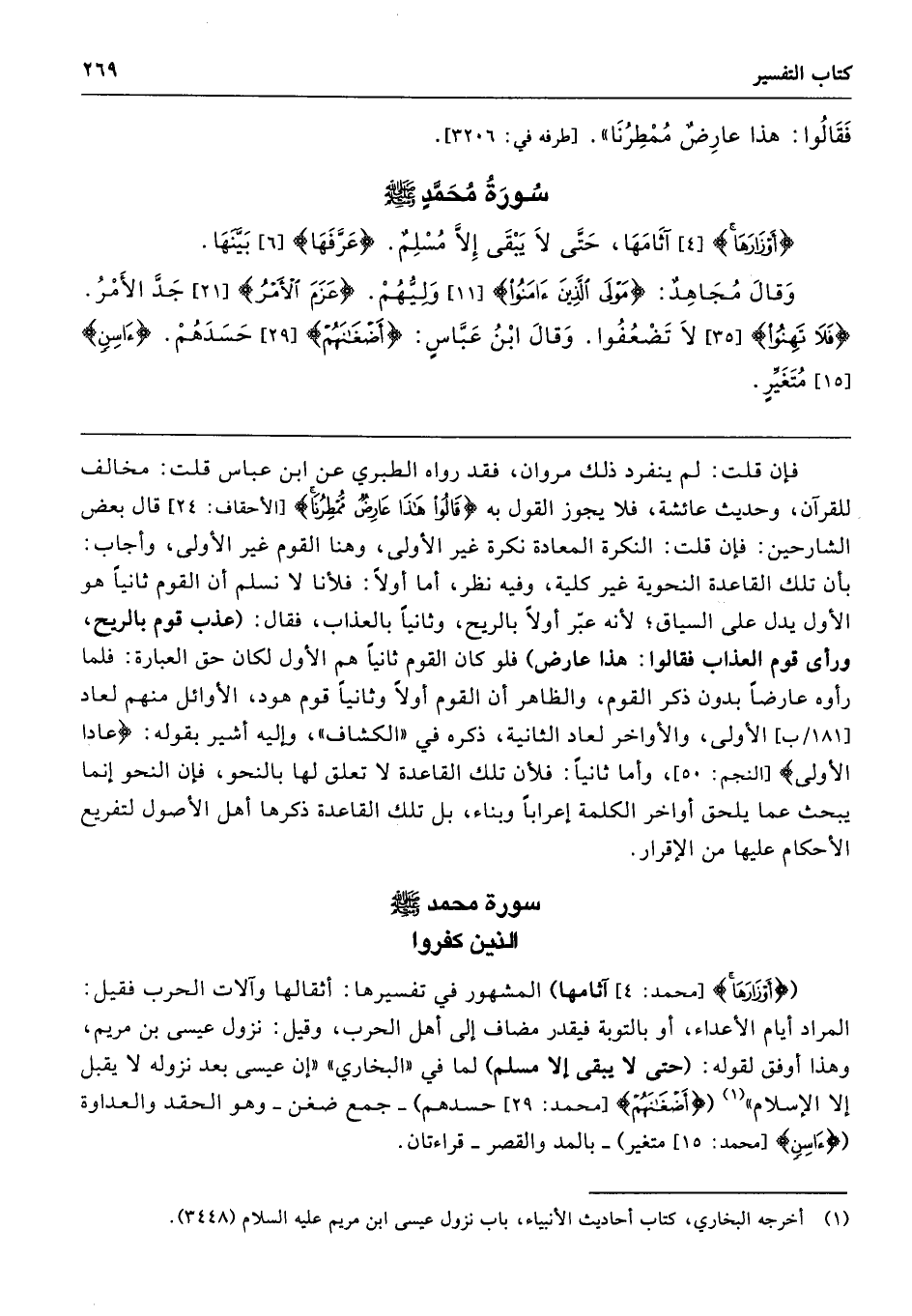({أَوْزَارَهَا} [محمد: 4] آثامها) المشهور في تفسيرها: أثقالها وآلات الحرب فقيل: المراد أيام الأعداء، أو بالتوبة فيقدر مضاف إلى أهل الحرب، وقيل: نزول عيسى بن مريم، وهذا أوفق لقوله: (حتى لا يبقى إلا مسلم) لما في "البخاري" "إن عيسى بعد نزوله لا يقبل إلا الإسلام" ({أَضْغَانَهُمْ} [محمد: 29] حسدهم) -جمع ضغن- وهو الحقد والعداوة ({آسِنٍ} [محمد: 15] متغير) -بالمد والقصر- قراءتان.