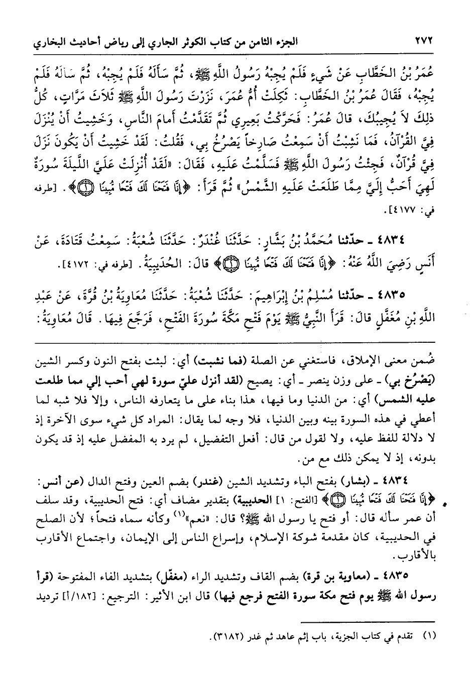 4834 - (بشار) بفتح الباء وتشديد الشين (غندر) بضم العين وفتح الدال (عن أنس: {إِنَّا فَتَحْنَا لَكَ فَتْحًا مُبِينًا} [الفتح: 1] الحديبية) بتقدير مضاف أي: فتح الحديبية، وقد سلف أن عمر ساله قال: أو فتح يا رسول الله - صلى الله عليه وسلم -؟ قال: "نعم" وكأنه سماه فتحًا؛ لأن الصلح في الحديبية، كان مقدمة شوكة الإسلام، وإسراع الناس إلى الإيمان، واجتماع الأقارب بالأقارب.