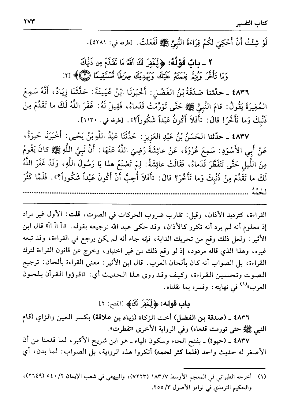 4836 - (صدقة بن الفضل) أخت الزكاة (زياد بن علاقة) بكسر العين والزاي (قام النبي - صلى الله عليه وسلم - حتى تورمت قدماه) وفي الرواية الأخرى "تفطرت".