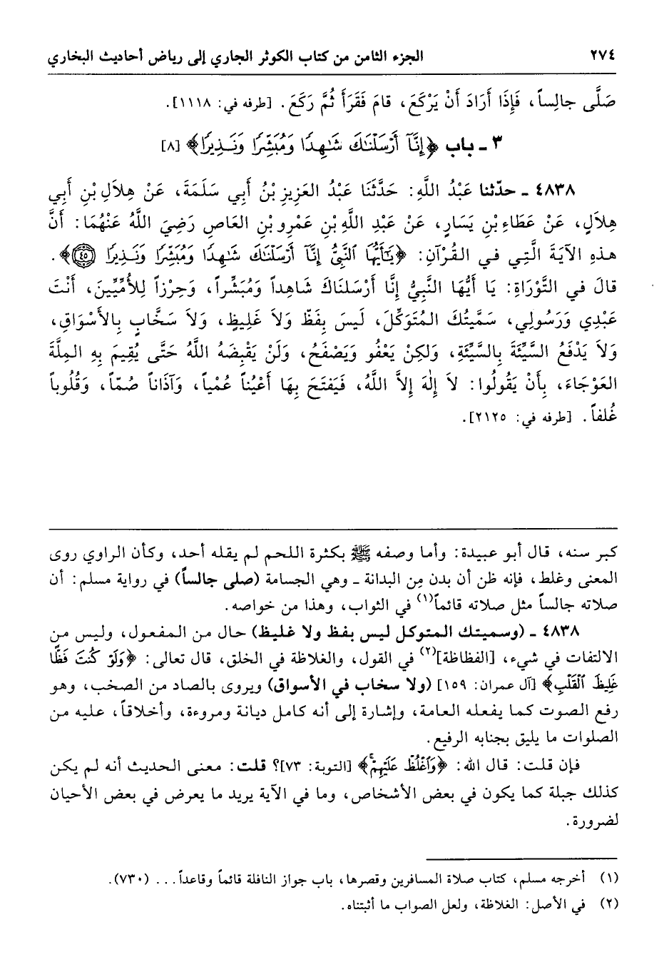 4838 - (وسميتك المتوكل ليس بفظ ولا غليظ) حال من المفعول، وليس من الالتفات في شيء، [الفظاظة] في القول، والغلاظة في الخلق، قال تعالى: {وَلَوْ كُنْتَ فَظًّا غَلِيظَ الْقَلْبِ} [اَل عمران: 159] (ولا سخاب في الأسواق) ويروى بالصاد من الصخب، وهو رفع الصوت كما يفعله العامة، وإشارة إلى أنه كامل ديانة ومروءة، وأخلاقًا، عليه من الصلوات ما يليق بجنابه الرفيع.
