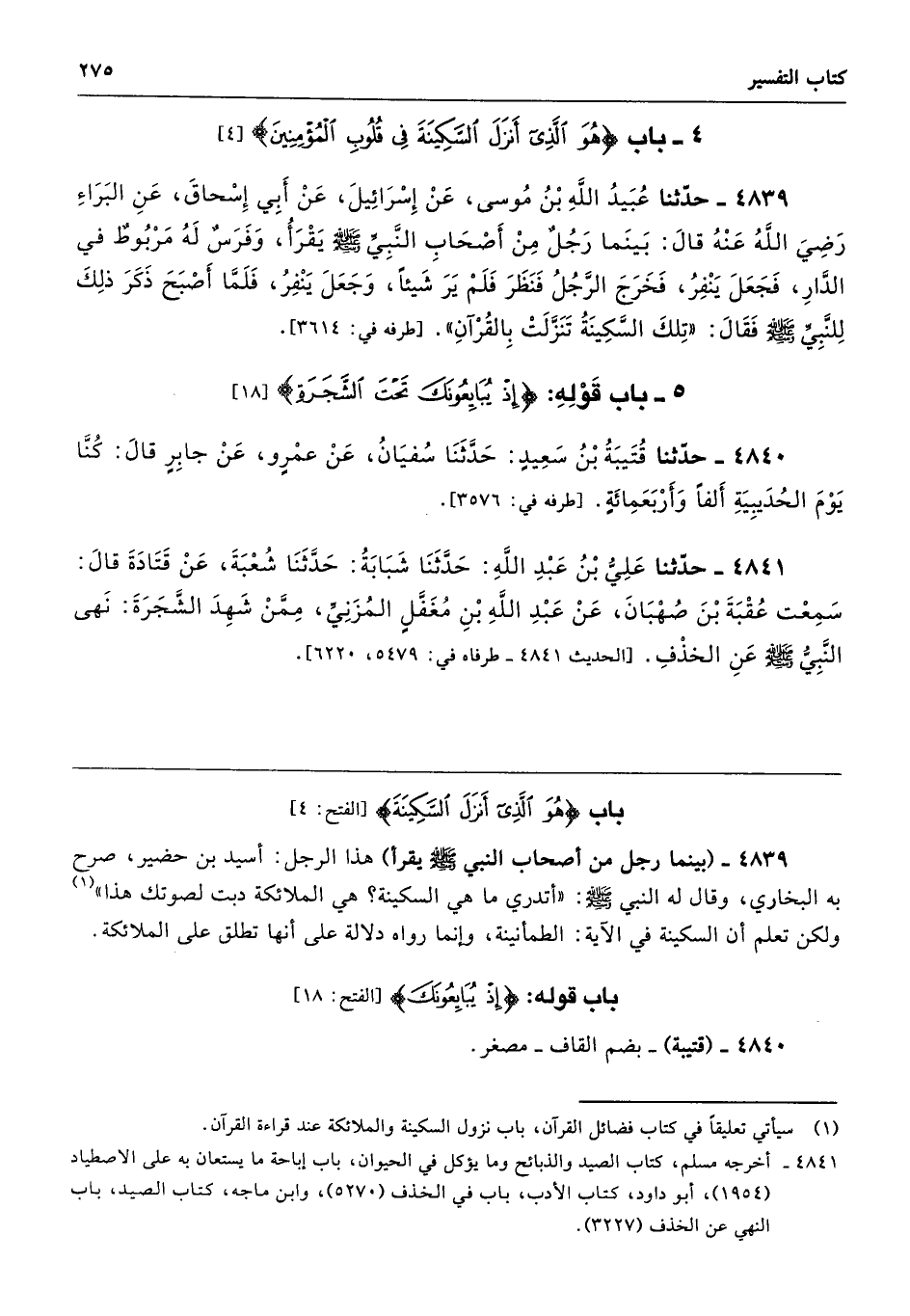 4839 - (بينما رجل من أصحاب النبي - صلى الله عليه وسلم - يقرأ) هذا الرجل: أسيد بن حضير، صرح به البخاري، وقال له النبي - صلى الله عليه وسلم -: "أتدري ما هي السكينة؟ هي الملائكة دبت لصوتك هذا" ولكن تعلم أن السكينة في الآية: الطمأنينة، وإنما رواه دلالة على أنها تطلق على الملائكة.
