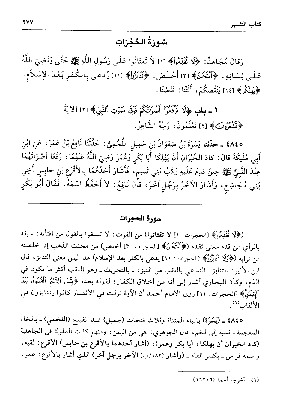 {لَا تُقَدِّمُوا} [الحجرات: 1] لا تفتاتوا) من الفوت: لا تسبقوا بالقول من افتأته: سبقه بالرأي من قدم معنى تقدم ({امْتَحَنَ} [الحجرات: 3] أخلص) من محنت الذهب إذا خلصته من ترابه ({وَلَا تَنَابَزُوا} [الحجرات: 11] يدعى بالكفر بعد الإسلام) هذا ليس معنى التنابز، قال ابن الأثير: التنابز: التداعي باللقب من النبز، -بالتحريك- وهو اللقب أكثر ما يكون في الذم، وكأن البخاري أشار إلى أنه من أخلاق الكفار؛ لقوله بعده {بِئْسَ الِاسْمُ الْفُسُوقُ بَعْدَ الْإِيمَانِ} [الحجرات: 11] روى الإمام أحمد أن الآية نزلت في الأنصار كانوا يتنابزون في الألقاب.
