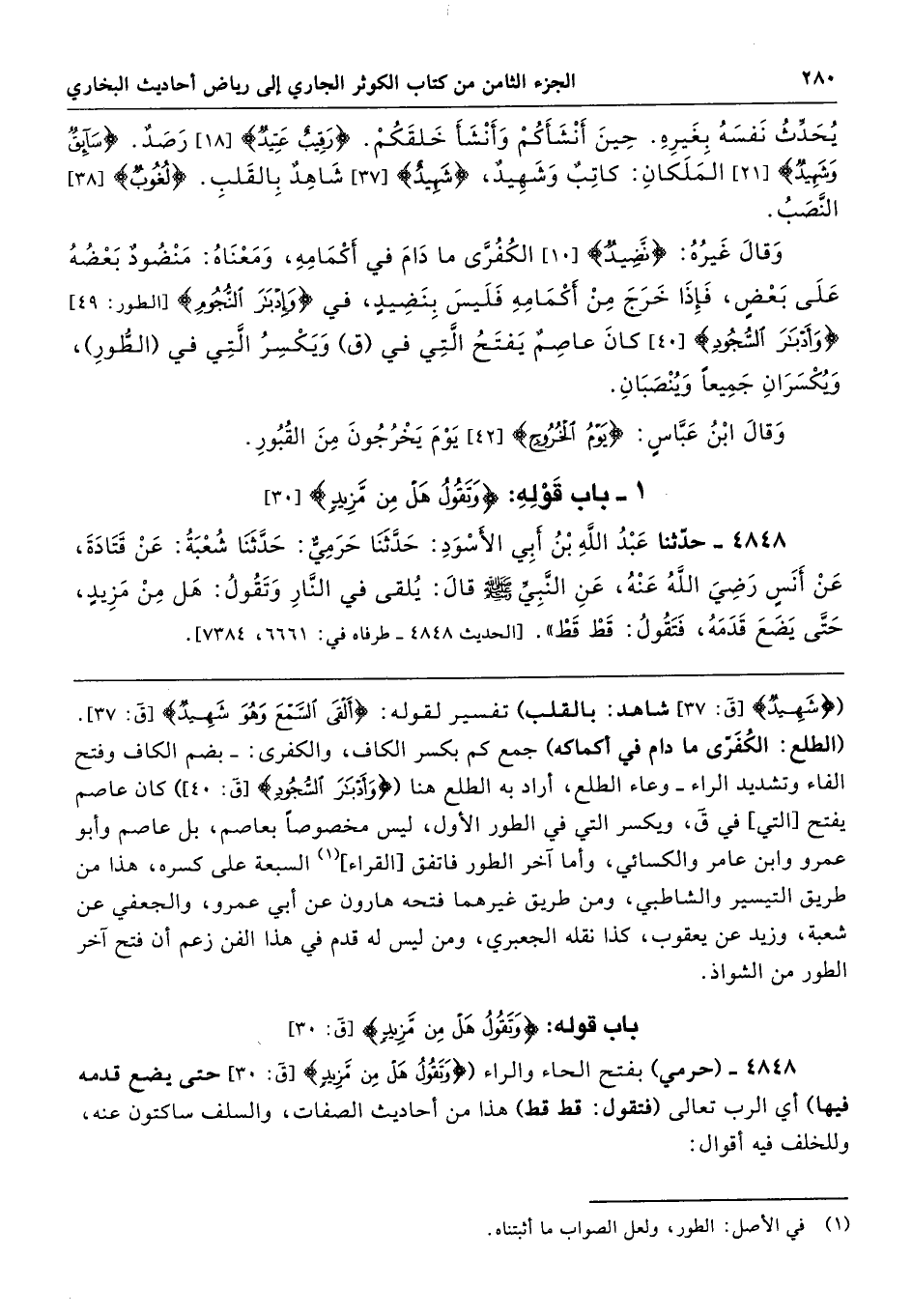 4848 - (حرمي) بفتح الحاء والراء ({وَتَقُولُ هَلْ مِنْ مَزِيدٍ} [ق: 30] حتى يضع قدمه فيها) أي الرب تعالى (فتقول: قط قط) هذا من أحاديث الصفات، والسلف ساكتون عنه، وللخلف فيه أقوال: