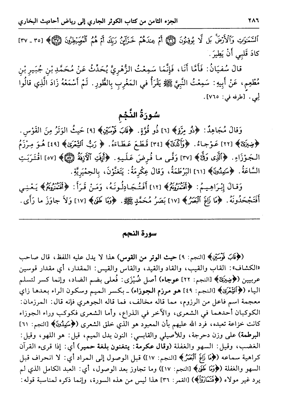 ({قَابَ قَوْسَيْنِ} [النجم: 9] حيث الوتر من القوس) هذا لا يدل عليه اللفظ، قال صاحب "الكشاف": القاب والقيب، والقاد والقيد، والقاس والقيس: المقدار، أي مقدار قوسين عربيين ({ضِيزَى} [النجم: 22] عوجاء) أصل ضُيْزَى: فُعلى بضم الضاد، وإنما كسر لتسلم الياء ({الشِّعْرَى} [النجم: 49] هو مرزم الجوزاء) -بكسر الميم وسكون الراء بعدها زاي معجمة اسم فاعل من الرزوم، مما قاله مخالف، فما قاله الجوهري فإنه قال: المرزمان: الكوكبان أحدهما في الشعرى، والآخر في الذراع، وأما الشعرى فكوكب وراء الجوزاء كانت خزاعة تعبده، فرد الله عليهم بأن المعبود هو الذي خلق الشعرى ({سَامِدُونَ} [النجم: 61] البرطمة) على وزن دحرجة، وللأصيلي والقابسي: النون بدل الميم، قيل: هو اللهو، وقيل: الغضب، وقيل: السهو والغفلة (وقال عكرمة: يتغنون بلغة حمير) أي: إذا قرئ القرآن كراهية سماعه ({مَا زَاغَ الْبَصَرُ} [النجم: 17]) قبل الوصول إلى المراد أي: لا انحراف قبل السهو والغفلة ({وَمَا طَغَى} [النجم: 17]) وما تجاوز بعد الوصول، أي: العبد الكامل الذي لم يرد غير مولاه ({فَتَمَارَوْا} [القمر: 36] هذا ليس من هذه السورة، وإنما ذكره لمناسبة قوله: