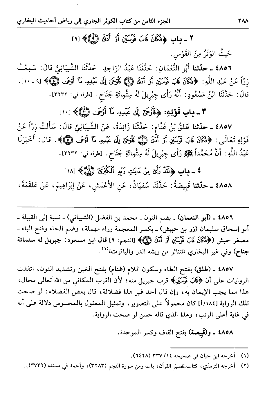 4856 - (أبو النعمان) -بضم النون- محمد بن الفضل (الشيباني) -نسبة إلى القبيلة- أبو إسحاق سليمان (زر بن حبيش) -بكسر المعجمة وراء مهملة، وضم الحاء وفتح الباء- مصغر حبش ({فَكَانَ قَابَ قَوْسَيْنِ أَوْ أَدْنَى} [النجم: 9] قال ابن مسعود: جبريل له ستمائة جناح) وفي غير البخاري "تتناثر من ريشه الدر والياقوت".
