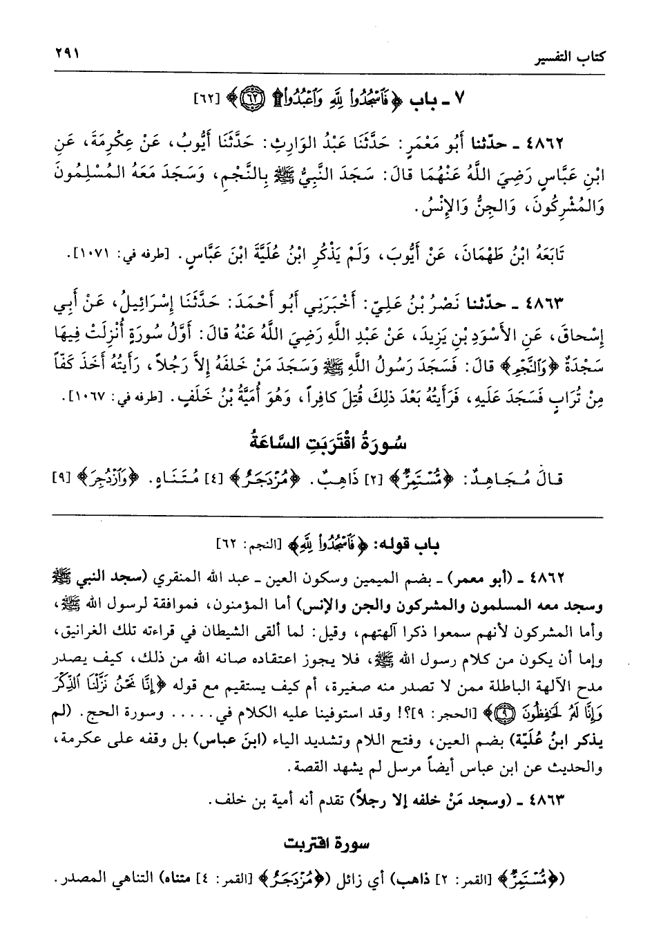 4862 - (أبو معمر) -بضم الميمين وسكون العين- عبد الله المنقري (سجد النبي - صلى الله عليه وسلم - وسجد معه المسلمون والمشركون والجن والإنس) أما المؤمنون، فموافقة لرسول الله - صلى الله عليه وسلم -، وأما المشركون لأنهم سمعوا ذكرا آلهتهم، وقيل: لما ألقى الشيطان في قراءته تلك الغرانيق، وإما أن يكون من كلام رسول الله - صلى الله عليه وسلم -، فلا يجوز اعتقاده صانه الله من ذلك، كيف يصدر مدح الآلهة الباطلة ممن لا تصدر منه صغيرة، أم كيف يستقيم مع قوله {إِنَّا نَحْنُ نَزَّلْنَا الذِّكْرَ وَإِنَّا لَهُ لَحَافِظُونَ} [الحجر: 9]؟! وقد استوفينا عليه الكلام في ..... وسورة الحج. (لم يذكر ابنُ عُلَيّة) بضم العين، وفتح اللام وتشديد الياء (ابنَ عباس) بل وقفه على عكرمة، والحديث عن ابن عباس أيضًا مرسل لم يشهد القصة.