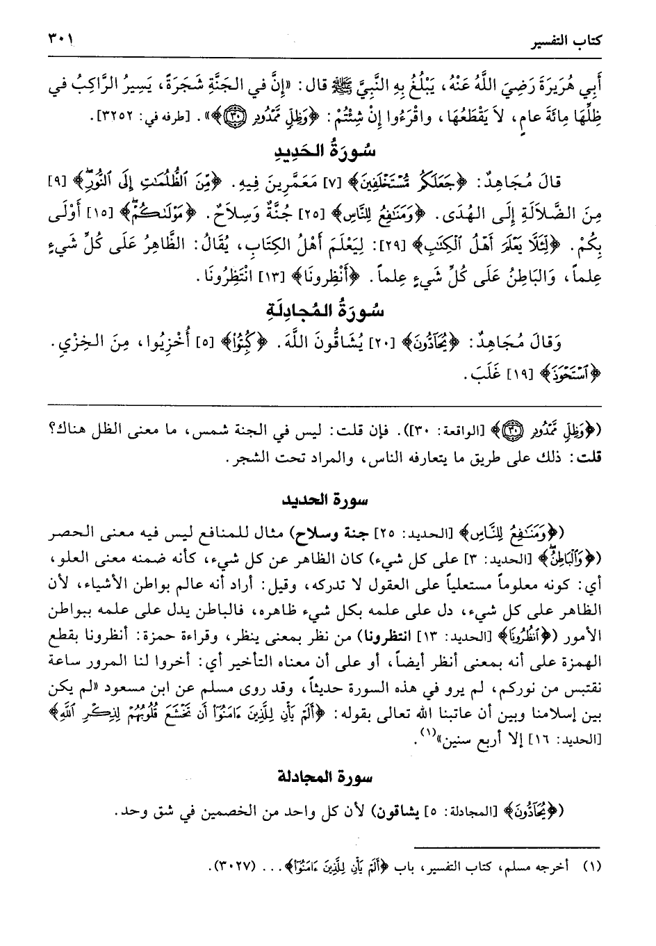 {وَمَنَافِعُ لِلنَّاسِ} [الحديد: 25] جنة وسلاح) مثال للمنافع ليس فيه معنى الحصر {وَالْبَاطِنُ} [الحديد: 3] على كل شيء) كان الظاهر عن كل شيء، كأنه ضمنه معشى العلو، أي: كونه معلومًا مستعليًا على العقول لا تدركه، وقيل: أراد أنه عالم بواطن الأشياء، لأن الظاهر على كل شيء، دل على علمه بكل شيء ظاهره، فالباطن يدل على علمه ببواطن الأمور {انْظُرُونَا} [الحديد: 13] انتظرونا) من نظر بمعنى ينظر، وقراءة حمزة: أنظرونا بقطع الهمزة على أنه بمعنى أنظر أيضًا، أو على أن معناه التأخير أي: أخروا لنا المرور ساعة نقتبس من نوركم، لم يرو في هذه السورة حديثًا، وقد روى مسلم عن ابن مسعود "لم يكن بين إسلامنا وبين أن عاتبنا الله تعالى بقوله: {أَلَمْ يَأْنِ لِلَّذِينَ آمَنُوا أَنْ تَخْشَعَ قُلُوبُهُمْ لِذِكْرِ اللَّهِ} [الحديد: 16] إلا أربع سنين".