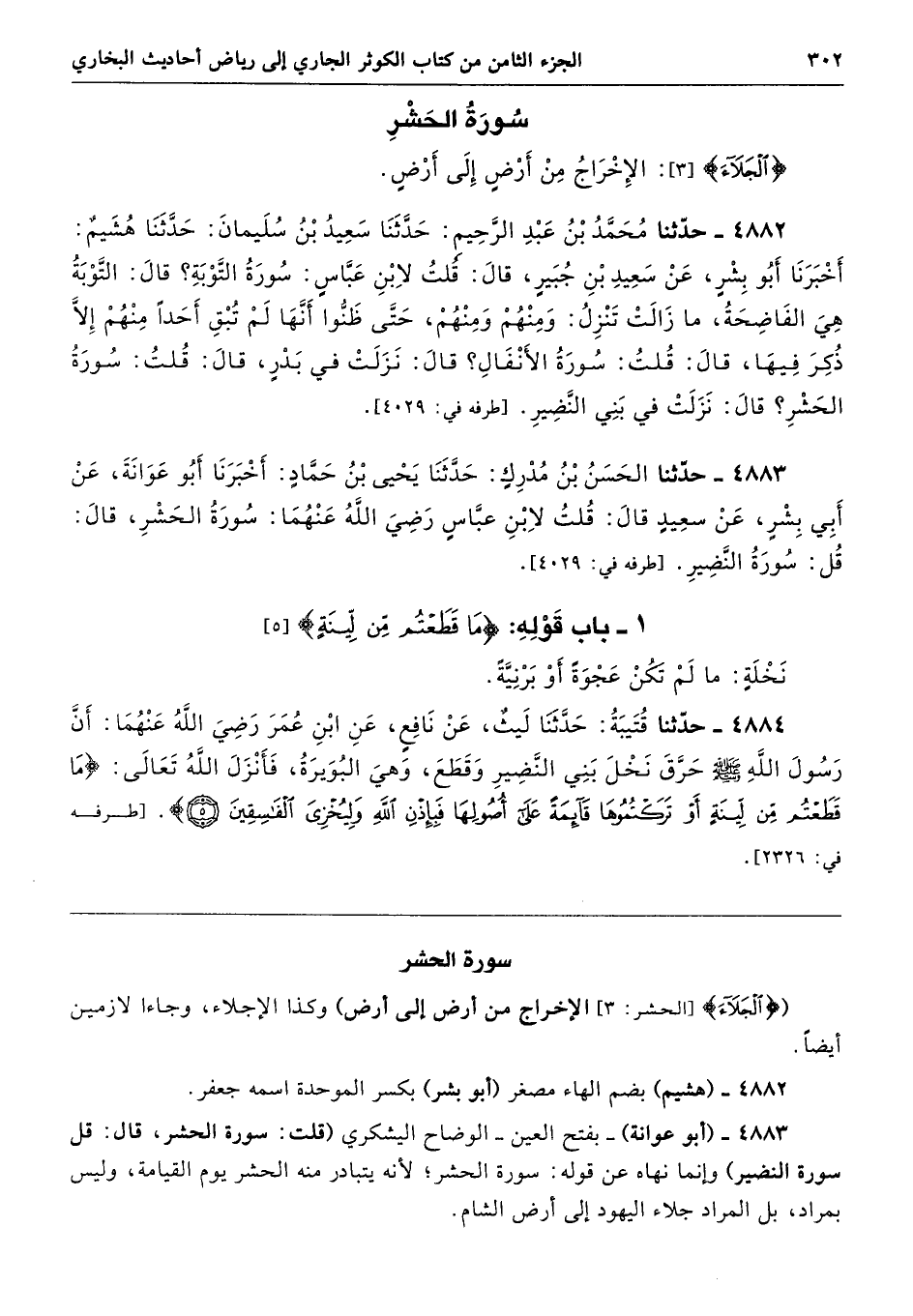 4883 - (أبو عوانة) -بفتح العين- الوضاح اليشكري (قلت: سورة الحشر، قال: قل سورة النضير) وإنما نهاه عن قوله: سورة الحشر؛ لأنه يتبادر منه الحشر يوم القيامة، وليس بمراد، بل المراد جلاء اليهود إلى أرض الشام.