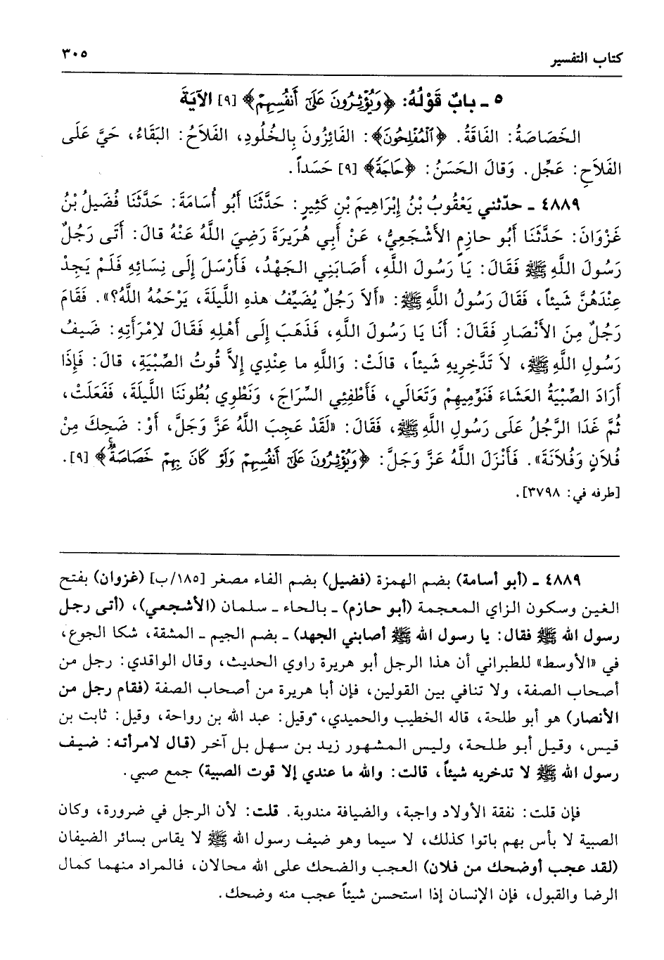 4889 - حَدَّثَنِى يَعْقُوبُ بْنُ إِبْرَاهِيمَ بْنِ كَثِيرٍ حَدَّثَنَا أَبُو أُسَامَةَ حَدَّثَنَا فُضَيْلُ بْنُ غَزْوَانَ حَدَّثَنَا أَبُو حَازِمٍ الأَشْجَعِىُّ عَنْ أَبِى هُرَيْرَةَ - رضى الله عنه - قَالَ أَتَى رَجُلٌ رَسُولَ اللَّهِ - صلى الله عليه وسلم - فَقَالَ يَا رَسُولَ اللَّهِ أَصَابَنِى الْجَهْدُ فَأَرْسَلَ إِلَى نِسَائِهِ فَلَمْ يَجِدْ عِنْدَهُنَّ شَيْئًا، فَقَالَ رَسُولُ اللَّهِ - صلى الله عليه وسلم - «أَلاَ رَجُلٌ يُضَيِّفُ هَذِهِ اللَّيْلَةَ يَرْحَمُهُ اللَّهُ». فَقَامَ رَجُلٌ مِنَ الأَنْصَارِ فَقَالَ أَنَا يَا رَسُولَ اللَّهِ. فَذَهَبَ إِلَى أَهْلِهِ فَقَالَ لاِمْرَأَتِهِ ضَيْفُ رَسُولِ اللَّهِ - صلى الله عليه وسلم - لاَ تَدَّخِرِيهِ شَيْئًا. قَالَتْ وَاللَّهِ مَا عِنْدِى إِلاَّ قُوتُ الصِّبْيَةِ. قَالَ فَإِذَا أَرَادَ الصِّبْيَةُ الْعَشَاءَ فَنَوِّمِيهِمْ، وَتَعَالَىْ فَأَطْفِئِى السِّرَاجَ وَنَطْوِى بُطُونَنَا اللَّيْلَةَ. فَفَعَلَتْ ثُمَّ غَدَا الرَّجُلُ عَلَى رَسُولِ اللَّهِ - صلى الله عليه وسلم - فَقَالَ «لَقَدْ عَجِبَ اللَّهُ عَزَّ وَجَلَّ - أَوْ ضَحِكَ - مِنْ فُلاَنٍ وَفُلاَنَةَ». فَأَنْزَلَ اللَّهُ عَزَّ وَجَلَّ (وَيُؤْثِرُونَ عَلَى أَنْفُسِهِمْ وَلَوْ كَانَ بِهِمْ خَصَاصَةٌ). طرفه 3798