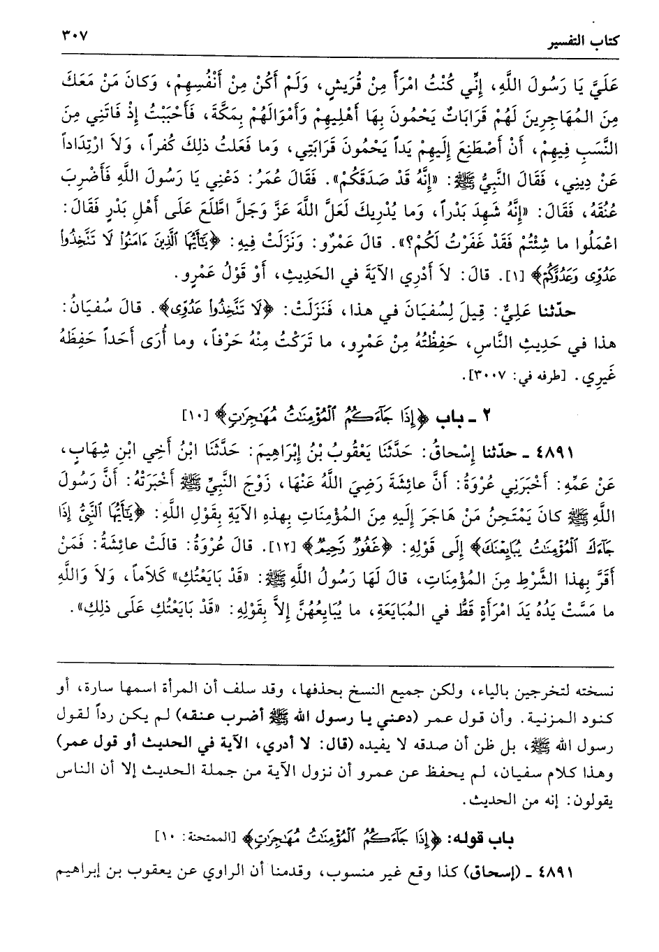 4891 - حَدَّثَنَا إِسْحَاقُ حَدَّثَنَا يَعْقُوبُ بْنُ إِبْرَاهِيمَ حَدَّثَنَا ابْنُ أَخِى ابْنِ شِهَابٍ عَنْ عَمِّهِ أَخْبَرَنِى عُرْوَةُ أَنَّ عَائِشَةَ - رضى الله عنها - زَوْجَ النَّبِيِّ - صلى الله عليه وسلم - أَخْبَرَتْهُ أَنَّ رَسُولَ اللَّهِ - صلى الله عليه وسلم - كَانَ يَمْتَحِنُ مَنْ هَاجَرَ إِلَيْهِ مِنَ الْمُؤْمِنَاتِ بِهَذِهِ الآيَةِ، بِقَوْلِ اللَّهِ (يَا أَيُّهَا النَّبِىُّ إِذَا جَاءَكَ الْمُؤْمِنَاتُ يُبَايِعْنَكَ) إِلَى قَوْلِهِ (غَفُورٌ رَحِيمٌ). قَالَ عُرْوَةُ قَالَتْ عَائِشَةُ فَمَنْ أَقَرَّ بِهَذَا الشَّرْطِ مِنَ الْمُؤْمِنَاتِ قَالَ لَهَا رَسُولُ اللَّهِ - صلى الله عليه وسلم - «قَدْ بَايَعْتُكِ». كَلاَمًا وَلاَ وَاللَّهِ مَا مَسَّتْ يَدُهُ يَدَ امْرَأَةٍ قَطُّ فِي الْمُبَايَعَةِ، مَا يُبَايِعُهُنَّ إِلاَّ بِقَوْلِهِ «قَدْ بَايَعْتُكِ عَلَى ذَلِكَ».
