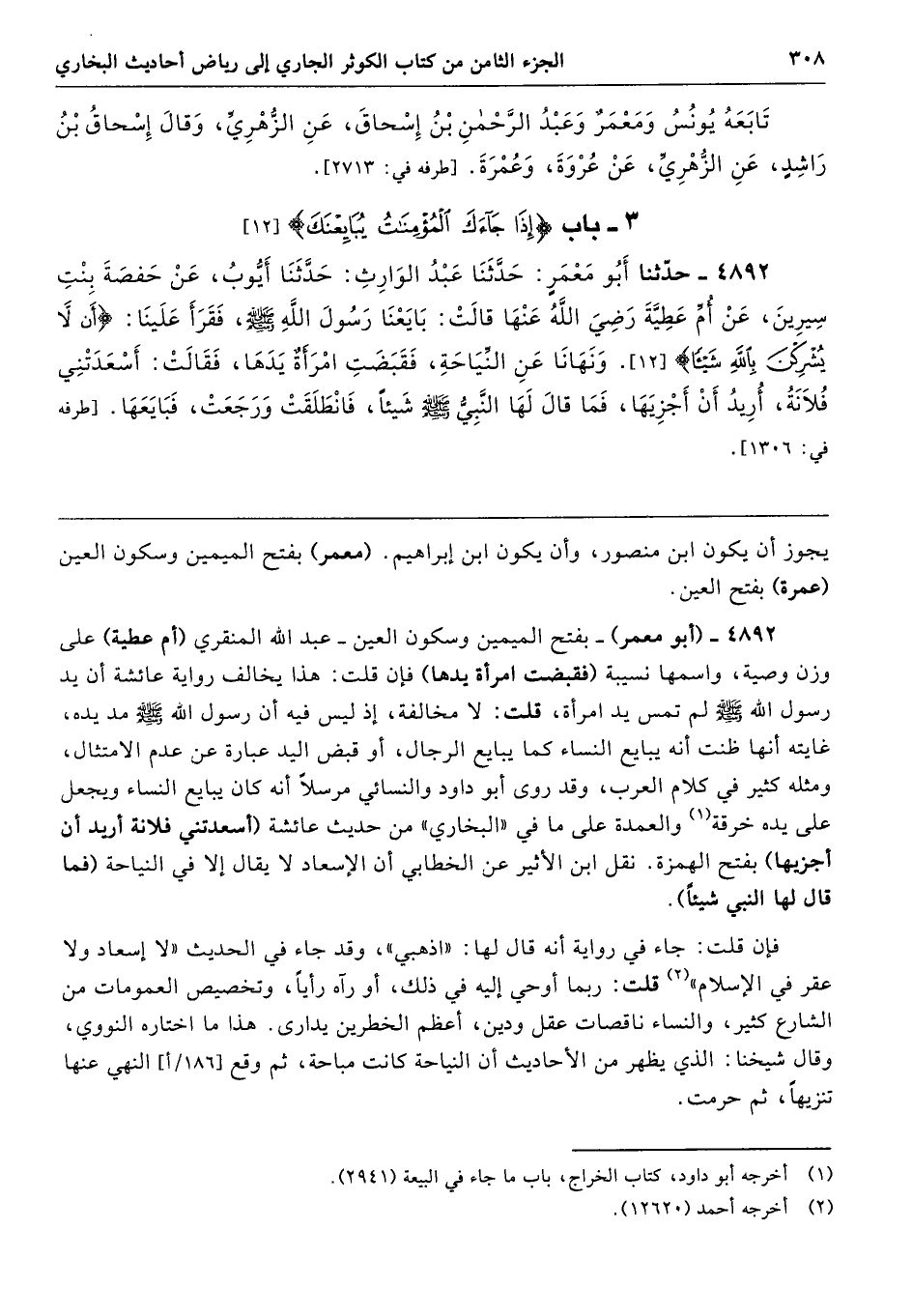 4892 - (أبو معمر) -بفتح الميمين وسكون العين- عبد الله المنقري (أم عطية) على وزن وصية، واسمها نسيبة (فقبضت امرأة يدها) فإن قلت: هذا يخالف رواية عائشة أن يد رسول الله - صلى الله عليه وسلم - لم تمس يد امرأة، قلت: لا مخالفة، إذ ليس فيه أن رسول الله - صلى الله عليه وسلم - مد يده، غايته أنها ظنت أنه يبايع النساء كما يبايع الرجال، أو قبض اليد عبارة عن عدم الامتثال، ومثله كثير في كلام العرب، وقد روى أبو داود والنسائي مرسلًا أنه كان يبايع النساء ويجعل على يده خرقة والعمدة على ما في "البخاري" من حديث عائشة (أسعدتني فلانة أريد أن أجزيها) بفتح الهمزة. نقل ابن الأثير عن الخطابي أن الإسعاد لا يقال إلا في النياحة (فما قال لها النبي شيئًا).
