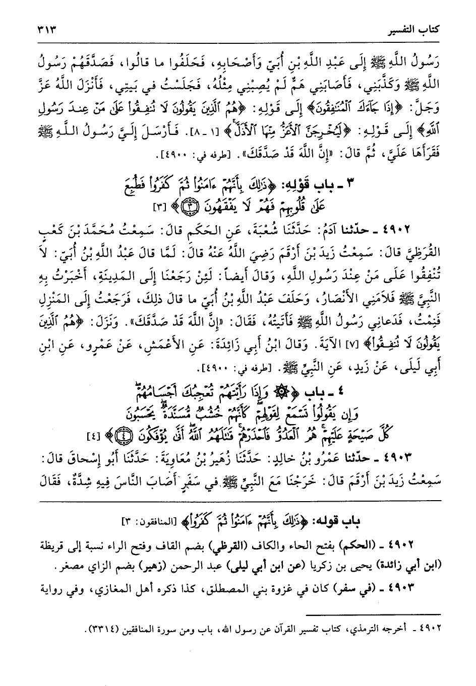4902 - حَدَّثَنَا آدَمُ حَدَّثَنَا شُعْبَةُ عَنِ الْحَكَمِ قَالَ سَمِعْتُ مُحَمَّدَ بْنَ كَعْبٍ الْقُرَظِىَّ قَالَ سَمِعْتُ زَيْدَ بْنَ أَرْقَمَ - رضى الله عنه - قَالَ لَمَّا قَالَ عَبْدُ اللَّهِ بْنُ أُبَىٍّ لاَ تُنْفِقُوا عَلَى مَنْ عِنْدَ رَسُولِ اللَّهِ. وَقَالَ أَيْضًا لَئِنْ رَجَعْنَا إِلَى الْمَدِينَةِ. أَخْبَرْتُ بِهِ النَّبِىَّ - صلى الله عليه وسلم - فَلاَمَنِى الأَنْصَارُ، وَحَلَفَ عَبْدُ اللَّهِ بْنُ أُبَىٍّ مَا قَالَ ذَلِكَ، فَرَجَعْتُ إِلَى الْمَنْزِلِ فَنِمْتُ فَدَعَانِى رَسُولُ اللَّهِ - صلى الله عليه وسلم - فَأَتَيْتُهُ فَقَالَ «إِنَّ اللَّهَ قَدْ صَدَّقَكَ». وَنَزَلَ (هُمُ الَّذِينَ يَقُولُونَ لاَ تُنْفِقُوا) الآيَةَ. وَقَالَ ابْنُ أَبِى زَائِدَةَ عَنِ الأَعْمَشِ عَنْ عَمْرٍو عَنِ ابْنِ أَبِى لَيْلَى عَنْ زَيْدٍ عَنِ النَّبِيِّ - صلى الله عليه وسلم -. طرفه 4900
