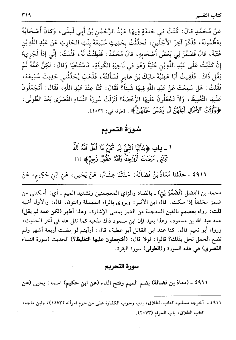 محمد بن الفضل (فَضَمَّزَ لِي) -بالضاد والزاي المعجمتين وتشديد الميم- أي: أسكتني من ضمز مخففًا إذا سكت. قال ابن الأثير: ويروى بالراء المهملة والنون، قال: والأول أشبه قلت: رواه بعضهم بالغين المعجمة من الغمز بمعنى الإشارة، وهذا أظهر (لكن عمه لم يقل) عمه عبد الله بن مسعود، وهذا بعيد فإن ابن مسعود ذاك مذهبه كما نقل عنه في آخر الحديث، ورواه أبو نعيم قال: كنا عند ابن القاتل أبو عطية، قال: أرأيتم لو مضت أربعة أشهر ولم تضع الحمل تحل بذلك؟ قالوا: لولا قال: (أفتجعلون عليها التغليظ؟) الحديث (سورة النساء القصرى) هي هذه السورة و (الطولى) سورة البقرة.