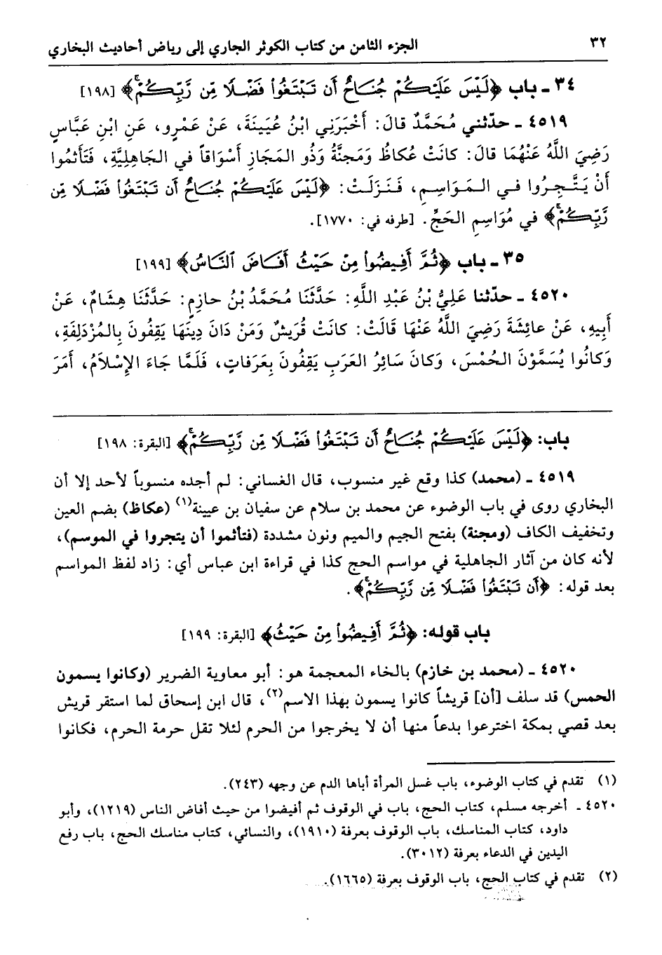4519 - (محمد) كذا وقع غير منسوب، قال الغساني: لم أجده منسوبًا لأحد إلا أن البخاري روى في باب الوضوء عن محمد بن سلام عن سفيان بن عيينة (عكاظ) بضم العين وتخفيف الكاف (ومجنة) بفنح الجيم والميم ونون مشددة (فتأثموا أن يتجروا في الموسم)، لأنه كان من آثار الجاهلية في مواسم الحج كذا في قراءة ابن عباس أي: زاد لفظ المواسم بعد قوله: {أَنْ تَبْتَغُوا فَضْلًا مِنْ رَبِّكُمْ}.