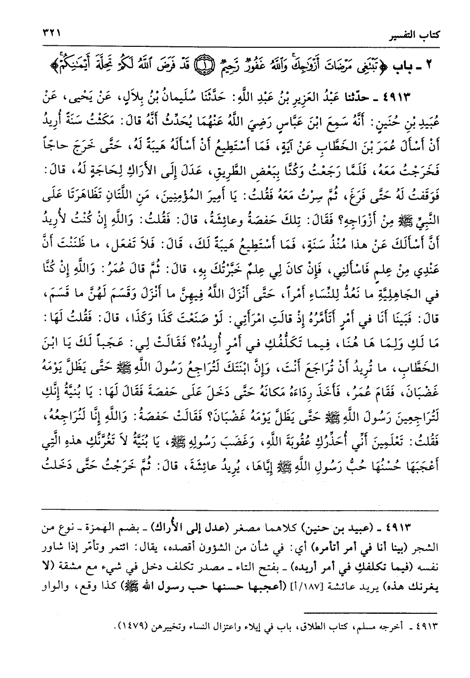 4913 - حَدَّثَنَا عَبْدُ الْعَزِيزِ بْنُ عَبْدِ اللَّهِ حَدَّثَنَا سُلَيْمَانُ بْنُ بِلاَلٍ عَنْ يَحْيَى عَنْ عُبَيْدِ بْنِ حُنَيْنٍ أَنَّهُ سَمِعَ ابْنَ عَبَّاسٍ - رضى الله عنهما - يُحَدِّثُ أَنَّهُ قَالَ مَكَثْتُ سَنَةً أُرِيدُ أَنْ أَسْأَلَ عُمَرَ بْنَ الْخَطَّابِ عَنْ آيَةٍ، فَمَا أَسْتَطِيعُ أَنْ أَسْأَلَهُ هَيْبَةً لَهُ، حَتَّى خَرَجَ حَاجًّا فَخَرَجْتُ مَعَهُ فَلَمَّا رَجَعْتُ وَكُنَّا بِبَعْضِ الطَّرِيقِ عَدَلَ إِلَى الأَرَاكِ لِحَاجَةٍ لَهُ - قَالَ - فَوَقَفْتُ لَهُ حَتَّى فَرَغَ سِرْتُ مَعَهُ فَقُلْتُ يَا أَمِيرَ الْمُؤْمِنِينَ مَنِ اللَّتَانِ تَظَاهَرَتَا عَلَى النَّبِيِّ - صلى الله عليه وسلم - مِنْ أَزْوَاجِهِ فَقَالَ تِلْكَ حَفْصَةُ وَعَائِشَةُ. قَالَ فَقُلْتُ وَاللَّهِ إِنْ كُنْتُ لأُرِيدُ أَنْ أَسْأَلَكَ عَنْ هَذَا مُنْذُ سَنَةٍ، فَمَا أَسْتَطِيعُ هَيْبَةً لَكَ. قَالَ فَلاَ تَفْعَلْ مَا ظَنَنْتَ أَنَّ عِنْدِى مِنْ عِلْمٍ فَاسْأَلْنِى، فَإِنْ كَانَ لِى عِلْمٌ خَبَّرْتُكَ بِهِ - قَالَ - ثُمَّ قَالَ عُمَرُ وَاللَّهِ إِنْ كُنَّا فِي الْجَاهِلِيَّةِ مَا نَعُدُّ لِلنِّسَاءِ أَمْرًا، حَتَّى أَنْزَلَ اللَّهُ فِيهِنَّ مَا أَنْزَلَ وَقَسَمَ لَهُنَّ مَا قَسَمَ - قَالَ - فَبَيْنَا أَنَا فِي أَمْرٍ أَتَأَمَّرُهُ إِذْ قَالَتِ امْرَأَتِى لَوْ صَنَعْتَ كَذَا وَكَذَا - قَالَ - فَقُلْتُ لَهَا مَالَكِ وَلِمَا هَا هُنَا فِيمَا تَكَلُّفُكِ فِي أَمْرٍ أُرِيدُهُ. فَقَالَتْ لِى عَجَبًا لَكَ يَا ابْنَ الْخَطَّابِ مَا تُرِيدُ أَنْ تُرَاجَعَ أَنْتَ، وَإِنَّ ابْنَتَكَ لَتُرَاجِعُ رَسُولَ اللَّهِ - صلى الله عليه وسلم - حَتَّى يَظَلَّ يَوْمَهُ غَضْبَانَ. فَقَامَ عُمَرُ فَأَخَذَ رِدَاءَهُ مَكَانَهُ حَتَّى دَخَلَ عَلَى حَفْصَةَ فَقَالَ لَهَا يَا بُنَيَّةُ إِنَّكِ لَتُرَاجِعِينَ رَسُولَ اللَّهِ - صلى الله عليه وسلم - حَتَّى يَظَلَّ يَوْمَهُ غَضْبَانَ. فَقَالَتْ حَفْصَةُ وَاللَّهِ إِنَّا لَنُرَاجِعُهُ. فَقُلْتُ. تَعْلَمِينَ أَنِّى أُحَذِّرُكِ عُقُوبَةَ اللَّهِ وَغَضَبَ رَسُولِهِ - صلى الله عليه وسلم - يَا بُنَيَّةُ لاَ يَغُرَّنَّكِ هَذِهِ الَّتِى أَعْجَبَهَا حُسْنُهَا حُبُّ رَسُولِ اللَّهِ - صلى الله عليه وسلم - إِيَّاهَا - يُرِيدُ عَائِشَةَ - قَالَ ثُمَّ خَرَجْتُ حَتَّى دَخَلْتُ